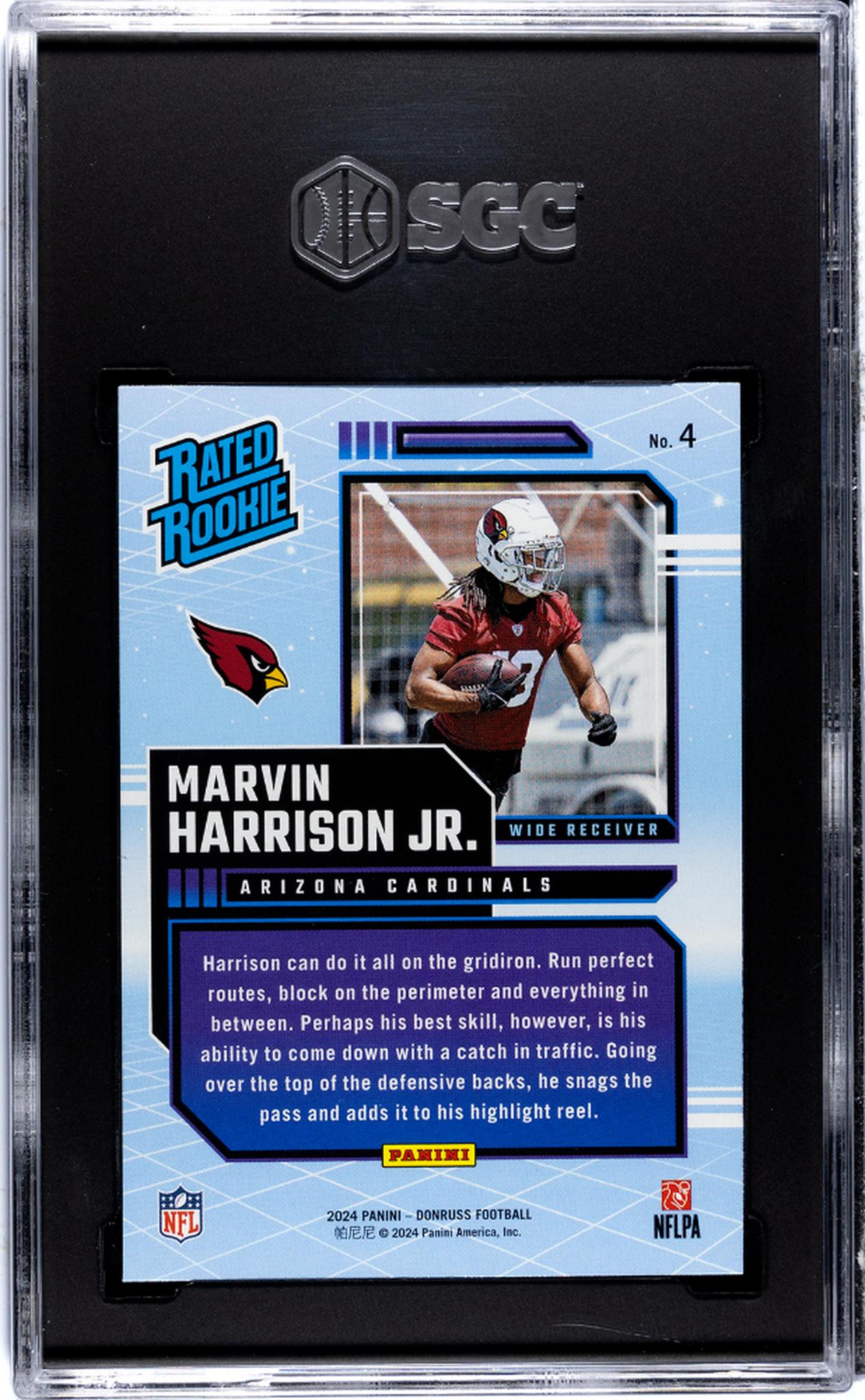 Stepping into the spotlight is the highly coveted 2024 Donruss #4 Marvin Harrison Jr. Rated Rookie Retro card. Manufactured by industry leader Panini, this card is a stunning addition to the Donruss series. This is not just any card, it is a Rookie card, signifying the start of Marvin Harrison Jr.'s professional journey with the Arizona Cardinals in the NFL, giving it a significant sentimentality and collectible value.