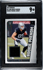 Immerse yourself in the captivating world of football with this Brock Bowers card. Its key features include its association with the Rookie Phenom Jersey set, its NFL standing, the Las Vegas Raiders affiliation, its 2024 Donruss branding by Panini, its SGC grading of 9, and the inclusion of jersey memorabilia.