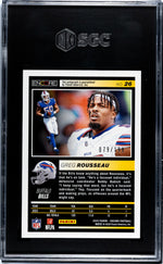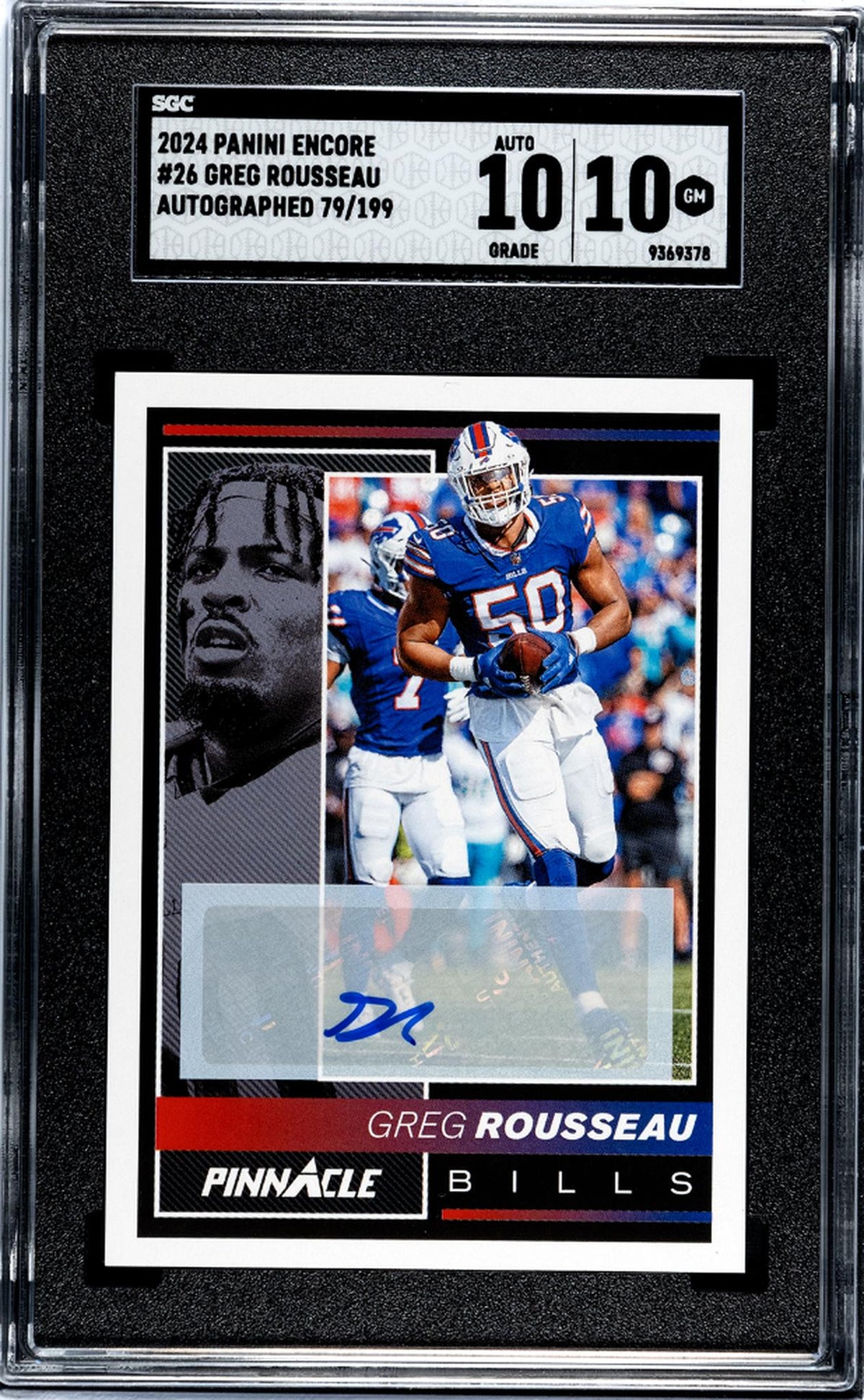 Noteworthy features of this card include its autograph, serial number, SGC grading, and its association with Panini Encore Pinnacle, the NFL, and the Buffalo Bills team. So why wait? Add this gem to your collection and let it shine in all its glory. This Greg Rousseau card is not just a card; it's a piece of NFL history that you can own. Don't miss out on this fantastic opportunity!