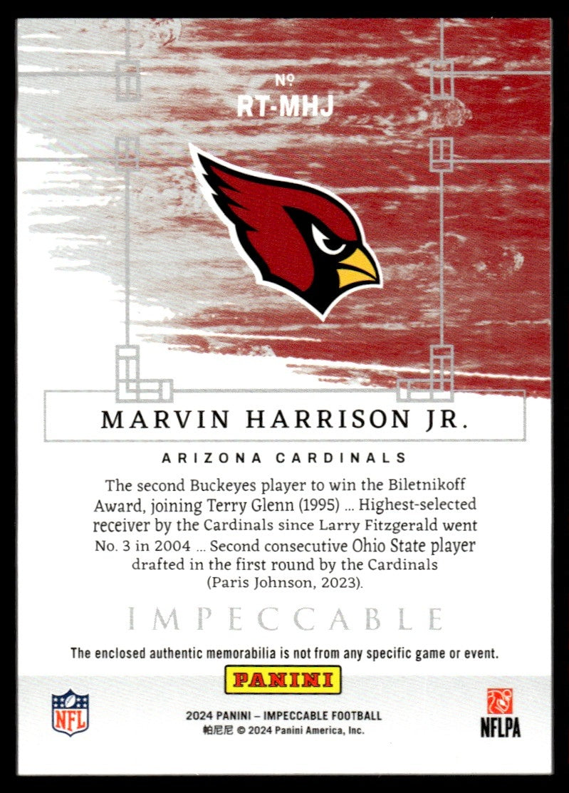 Capture a piece of NFL history with this 2024 Impeccable RT-MHJ Marvin Harrison Jr. 28/49 card. It's more than just a card - it's a tribute to the spirit of the game and the athletes who make it unforgettable. Own this card today and let the legacy of Marvin Harrison Jr. live on in your collection.