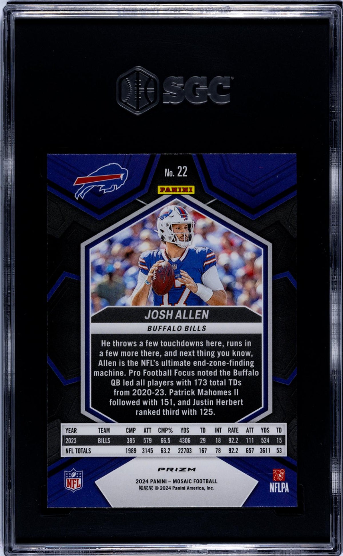 This card is not just a piece of cardboard, it's a piece of NFL history, a testament to the prowess of Josh Allen. It's a must-have for any Buffalo Bills fan, NFL enthusiasts, or sports card collectors. Investing in this card means investing in the legacy of one of football's finest. Don't miss out on the opportunity to make this 2024 Mosaic #22 Josh Allen Green Prizm card, a gem from the 'Mosaic Green Prizm' set, a part of your collection. It's not just a card, it's a tribute to the world of football, and it deserves a special place in your collection.