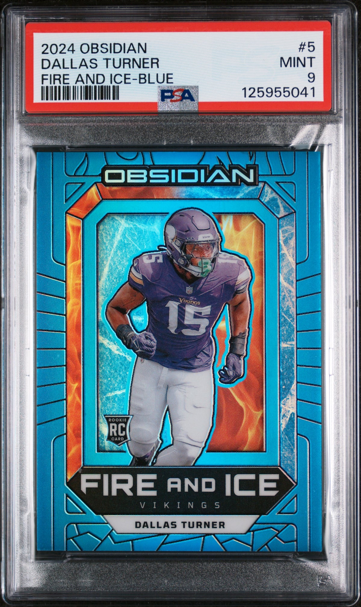 Step into the world of sports memorabilia with this pristine Dallas Turner Panini Obsidian rookie card from 2024 - a must-have for any serious collector. This card comes from the Fire and Ice insert set, making it a special find. Its fiery spirit and icy cool demeanor perfectly mirror Dallas Turner's own dynamic on-field presence. Manufactured by the renowned Panini company, this card is part of the Obsidian collection, a brand known for its high-quality products and unique aesthetics. The card is a stunning Blue Parallel edition, further enhancing its appeal. Even more exciting, it is serial numbered 03/25, making it a rare and valuable addition to your collection. This card commemorates Dallas Turner's rookie year with the NFL Vikings, capturing the essence of his early career, and is a fantastic way to celebrate his contributions to the team and the sport. Adding to its value, this card has been professionally graded by the PSA - the industry's leading grading company. With a numeric grade of 9, it falls into the 'Mint' condition category, indicating it has been well-preserved with only minor flaws. The card does not include any memorabilia, but its rarity, excellent condition, and connection to Dallas Turner make it a highly desirable piece nonetheless. This 2024 Obsidian #5 Dallas Turner card is not just a piece of sports memorabilia - it is a piece of sporting history ready to be added to your collection. The key features of this card include its rookie status, the Fire and Ice Blue design, the Serial No. 03/25, its PSA Mint 9 condition, its association with the NFL Vikings, and its place in the 2024 Panini Obsidian set. In conclusion, this Dallas Turner rookie card is a spectacular blend of sports history and collector's item appeal. It's a prime example of Panini's dedication to quality and attention to detail, making it a fantastic addition to any sports card collection. Don't miss out on owning this piece of Dallas Turner's legacy!