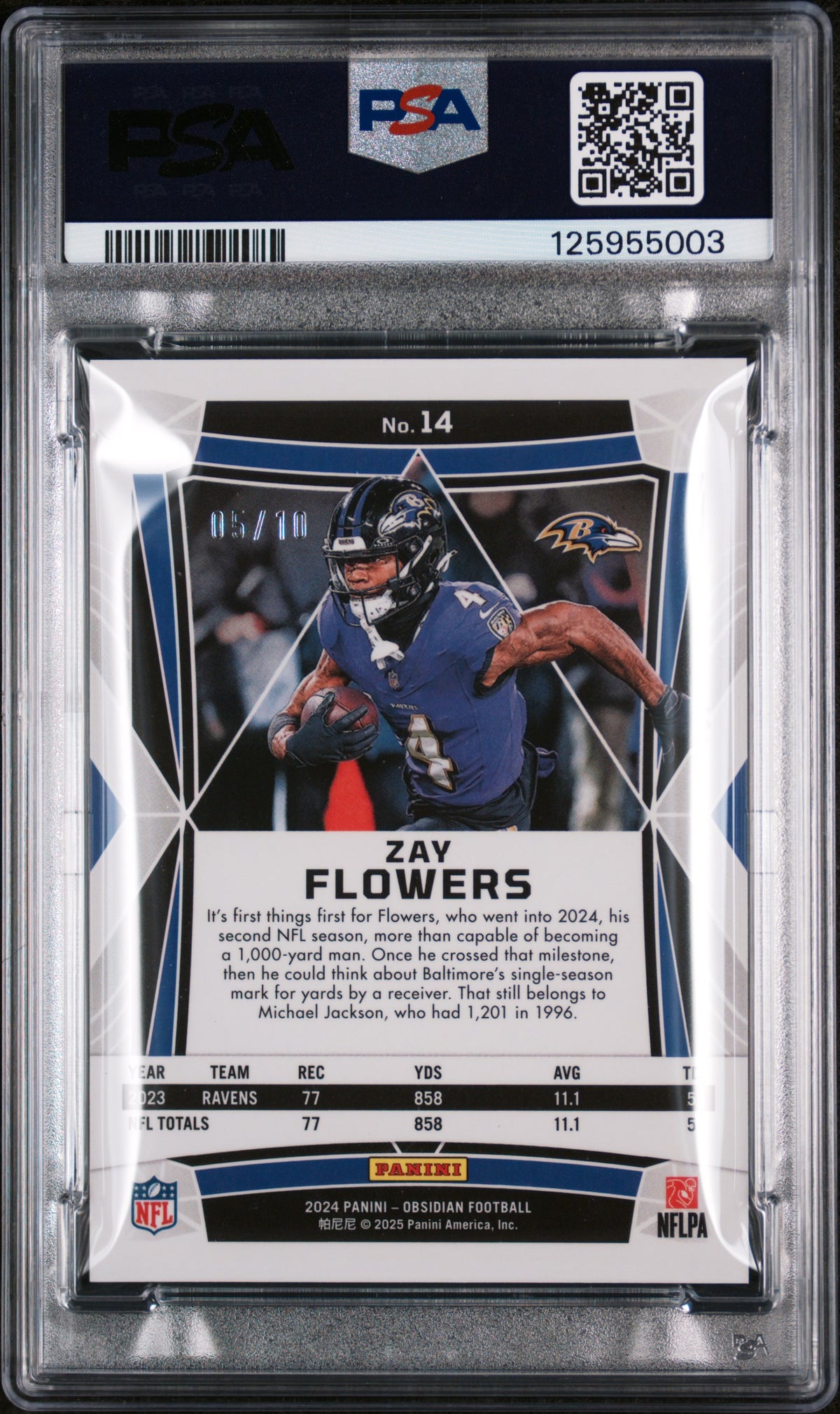 Welcome to the world of sports card collecting with this stunning 2024 Obsidian #14 Zay Flowers Gold card. Manufactured by the renowned Panini, this card is a spectacular representation of the Baltimore Ravens' star player, Zay Flowers. This card is not just a regular card, it's a Gold parallel, making it a rare and desirable piece for any collector. It's also serial numbered 05/10, indicating its limited edition status which enhances its value and collectability. This level of exclusivity is what every collector dreams of, and this card delivers it in full! The card isn't just rare, it's also in impeccable condition. Professionally graded by the PSA, this card boasts a Gem Mint 10 grade. The highest possible grade, it's a testament to the card's pristine condition. This card isn't a rookie card, but don't let that deter you. Zay Flowers' performance on the field is proof of his skills and this card is a wonderful way to commemorate his contributions to the NFL. As part of the Obsidian Football Set, this card stands out with its sleek design and high-quality print. The card's key features include its Gold parallel, PSA Gem Mint 10 grade, serial numbering, 2024 Obsidian edition, and association with the Baltimore Ravens and Zay Flowers. This isn't just a sports card, it's a piece of sports history and a testament to Zay Flowers' career. Grab this opportunity to own a part of NFL history, and add a distinct shine to your collection with this Gold parallel card. This card is a must-have for any dedicated sports card collector or Baltimore Ravens fan looking to enrich their collection with a touch of gold.