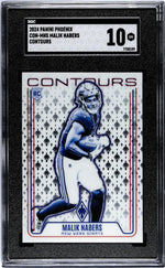 Behold the masterpiece from the house of Panini - The Malik Nabers 2024 Phoenix Contours Rookie Card. Immaculately preserved, this card hails from the much-acclaimed Phoenix brand and belongs to the coveted Contours insert set. A gem from the 2024 release, this card features the effervescent Malik Nabers, the star player from the New York Giants, one of the most celebrated teams in the NFL. The card's appeal is further elevated by its immaculate 'Gem Mint' condition, a testament to its pristine state and high-quality preservation. What makes this card stand apart is its perfect SGC grade of 10. This top-tier grading by SGC, a prestigious grading company, adds an unbeatable level of credibility to the card. It's a proof of the card's superior quality and impeccable condition, making it a highly desirable collectible for any sports card enthusiast. This card is not merely a piece of cardboard, but a cherished memento that encapsulates the early strides of Malik Nabers in the NFL. A rookie card in its purest form, it is a perfect keepsake to celebrate the beginnings of this remarkable player. Though this card does not feature autographs or memorabilia, its value lies in its simplicity and the raw talent it represents. It's a must-have addition to any football card collection, be it for seasoned collectors or those just starting their journey. In essence, this Malik Nabers 2024 Phoenix Contours Rookie Card is more than just a sports card; it's an investment, a keepsake, and a tribute to one of NFL's promising talents. Each glance at this card will take you back to the 2024 NFL season, a time when Malik Nabers was just a rookie making his mark in the league. Own this card and relive those moments, every day!