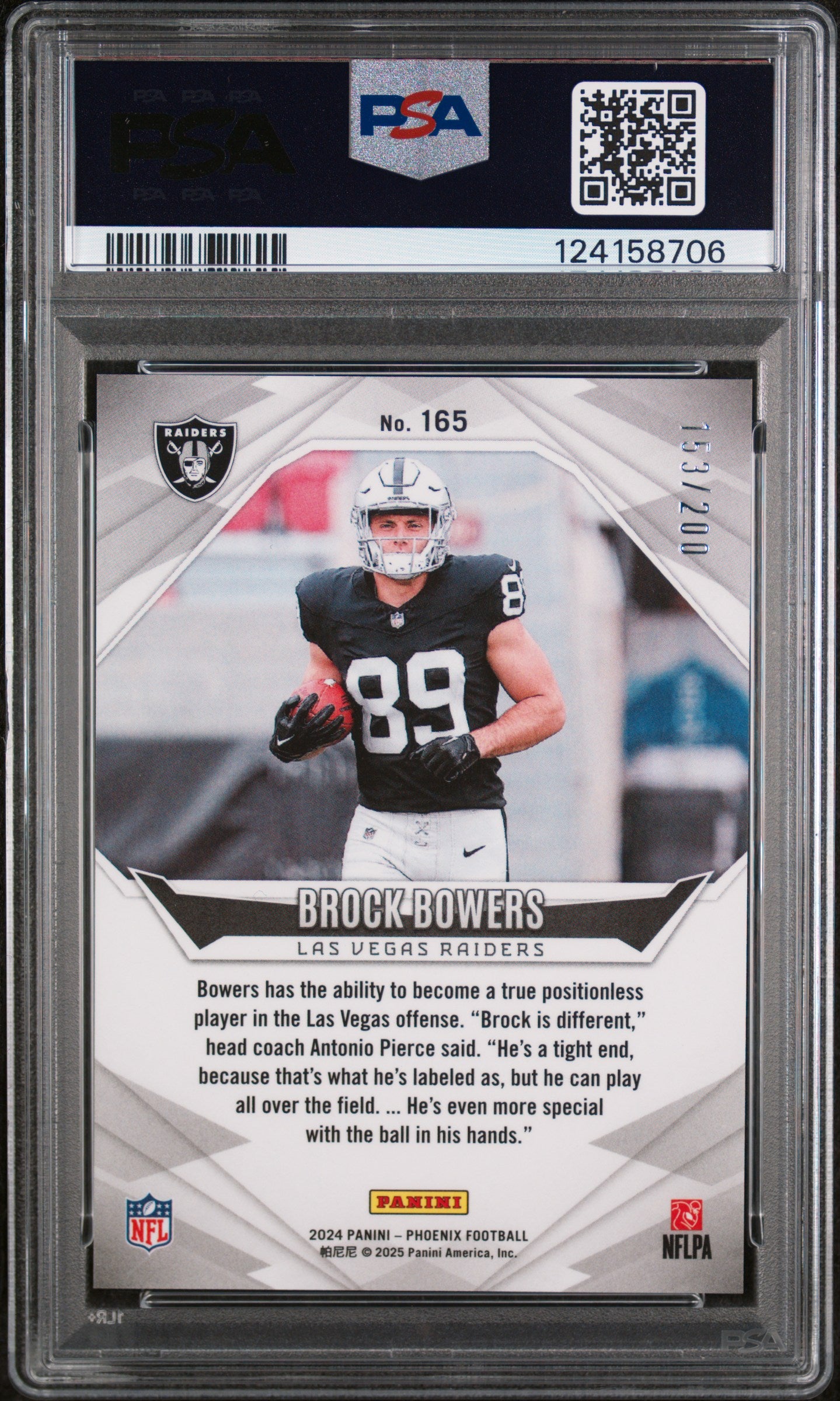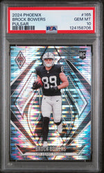 Proudly bearing the name '2024 Phoenix 165 Brock Bowers', it is a part of the iconic Phoenix Football Card Set. Key features to note include its Pulsar parallel, it being a Rookie card, its unique serial number, and the representation of Brock Bowers from the Las Vegas Raiders.