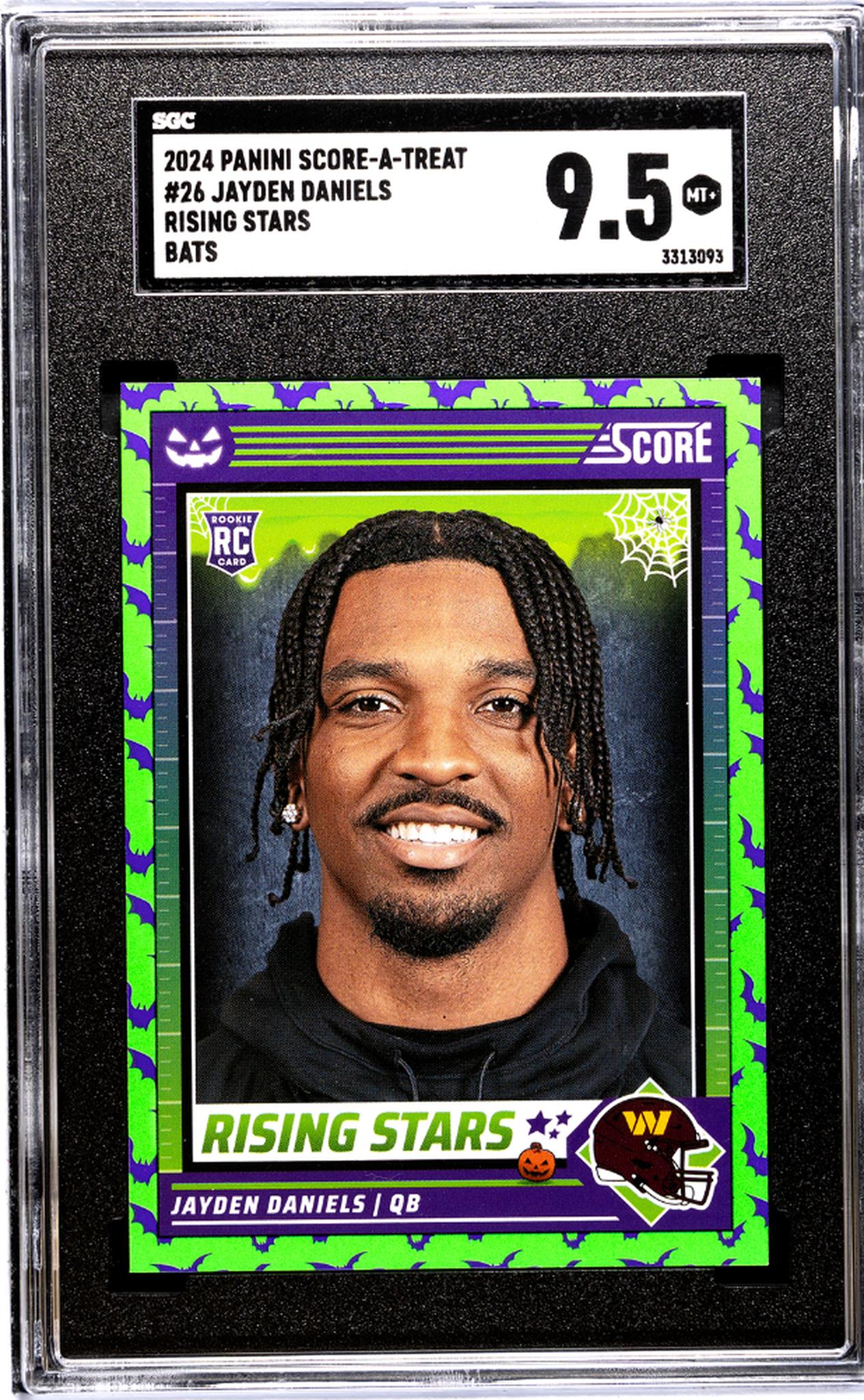 Steal the spotlight with this remarkable 2024 Score #26 Jayden Daniels Football Card! This extraordinary piece hails from the revered Panini manufacturer under the 'Score' brand, showcasing the immense talent of Jayden Daniels in his rookie year. This card is part of the highly coveted 'Rising Stars' insert set, a testament to the promising future of this NFL prodigy. The card is professionally graded by SGC, a renowned grading company, boasting a superior mint grade of 9.5. This grade is a testament to the impeccable condition of the card and ensures its value over time. The card holds a unique charm with its 'Bats' parallel, adding a dash of exclusivity to its appeal. What magnifies the allure of this card is the affiliation with the Washington Commanders team, one of the NFL's most distinguished franchises. Adding this card to your collection is a great way to celebrate their legacy and the potential of Jayden Daniels. This card is from the Panini Score-A-Treat Football Card Set, renowned for its Halloween-themed design. The spooky aesthetics of the card make it a quirky and distinctive addition to any sports card collection. Featuring the rising star Jayden Daniels, this card is an excellent investment for any sports memorabilia collector or Washington Commanders fan. The card's mint condition, unique design, and the association with a promising rookie make it a must-have. Don't miss the chance to own this piece of sports history!