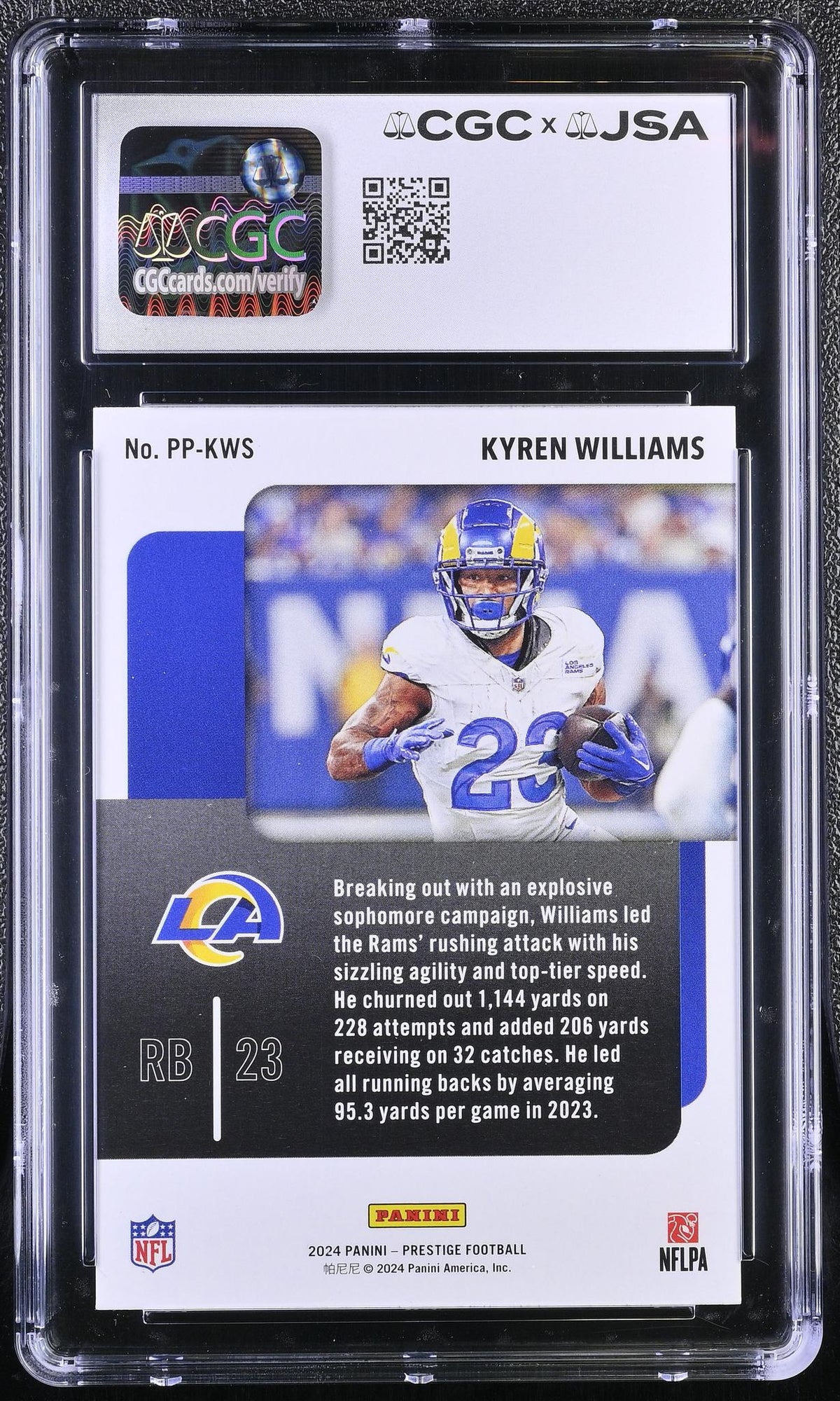 Kyren Williams, the dynamic running back of the Rams, is featured on this striking 2024 Panini Prestige Football card. A crucial asset to any serious football card collection, this card boasts not just the prestige of the Panini brand but also the signature of Kyren Williams himself. Its part of the highly coveted 'Prestigious Pros' insert set, a collection that holds a special significance for hobby enthusiasts. As an autographed card, it holds an extra layer of personal connection to the player, making it an irresistible addition to any collection. With Williams' rising popularity and the card's impeccable CGC AU 10 grading, demand for this card is expected to remain strong.