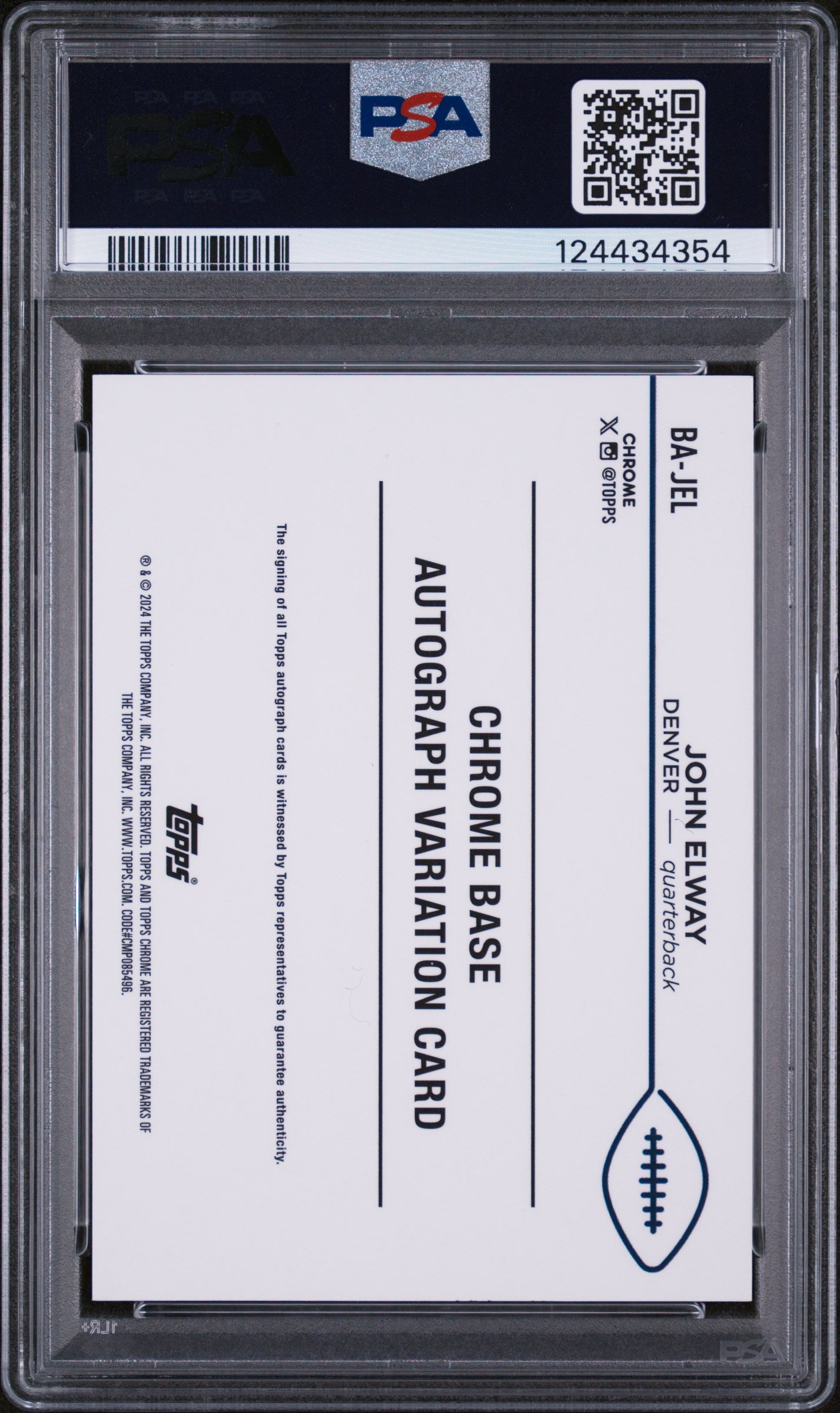 Dive into the world of sports card collecting with this remarkable 2024 Topps Chrome Autograph Variation of the legendary John Elway. Manufactured by Topps, this card is a part of the esteemed Topps Chrome line that is known for its high-quality production and glossy finish.