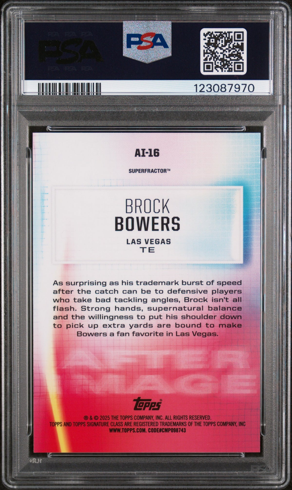 This card is not autographed and does not include memorabilia. However, its key features such as the Superfractor parallel, the Serial numbered 1/1, the PSA Gem Mint 10 grading, and its status as a Brock Bowers rookie card, more than make up for it.