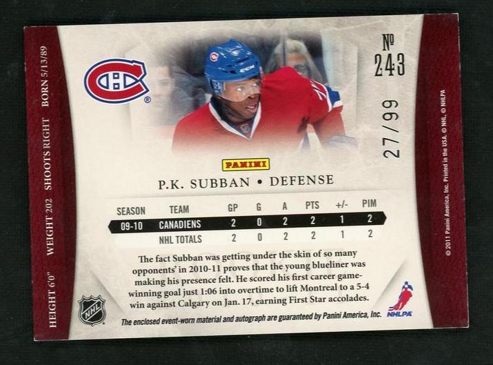 Feast your eyes on this stunning sports card featuring the esteemed player P.K. Subban! Manufactured by Panini in 2010, this extraordinary card is from the Luxury Suite set and holds the card number 243.