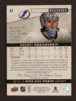 Bask in the glory of this exceptional Andrei Vasilevskiy Premier Rookies card from the renowned 2014 Upper Deck SP collection. This particular card, numbered 81, stands out as a true gem for any serious collector, as it features the young star in his rookie year with the Tampa Bay Lightning - a time when he first started to make his mark in the NHL.