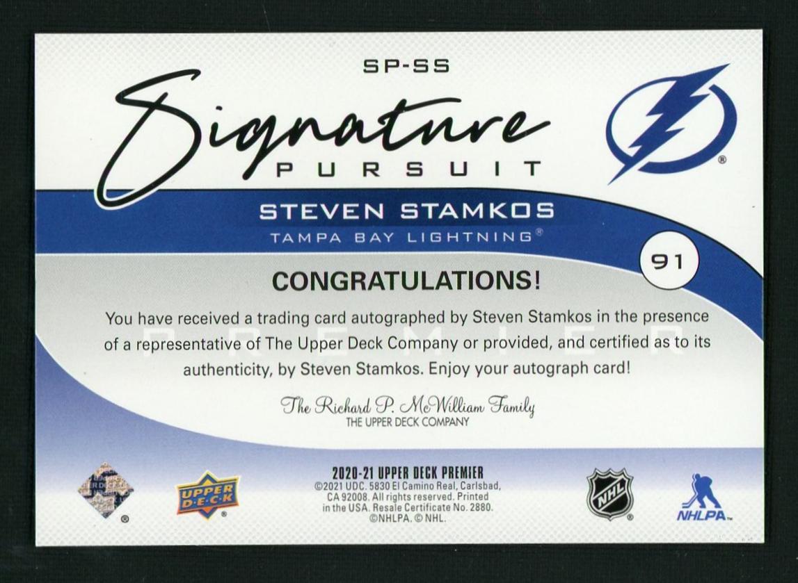 Step right up, sports enthusiasts and collectors! Feast your eyes on this exceptional 2020 Upper Deck Premier 'Signature Pursuit' card, featuring none other than the dynamite NHL player, Steven Stamkos of the Tampa Bay Lightning. This is not just any card, it's an autographed treasure, personally signed by Stamkos himself, adding a touch of authenticity and personality to your collection.