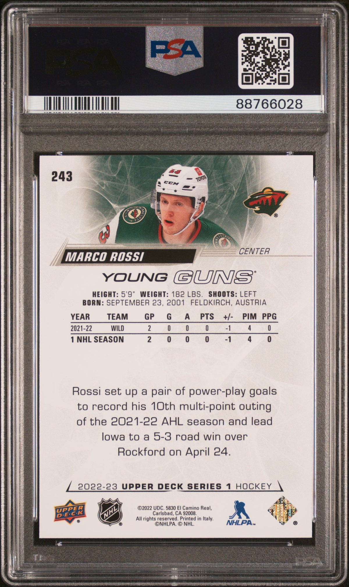 In conclusion, this Marco Rossi card is more than just a piece of cardboard; it's a ticket to the thrilling world of NHL, a snapshot of Rossi's nascent career, and a gem mint addition to your collection. Whether you're a fan of the 'Wild' team, an admirer of Rossi, or a collector of 'Upper Deck', this card is bound to leave you captivated.