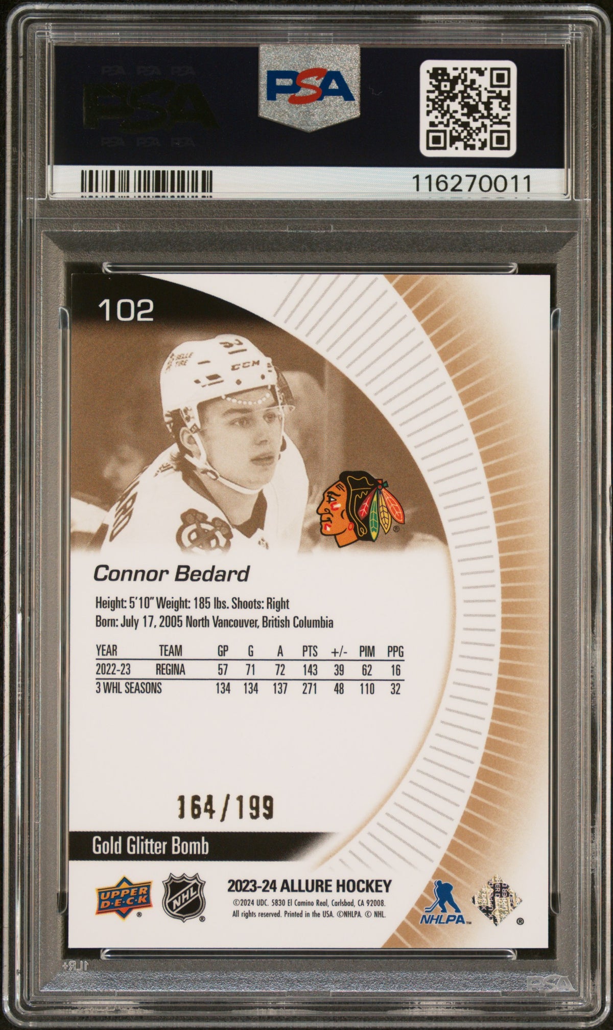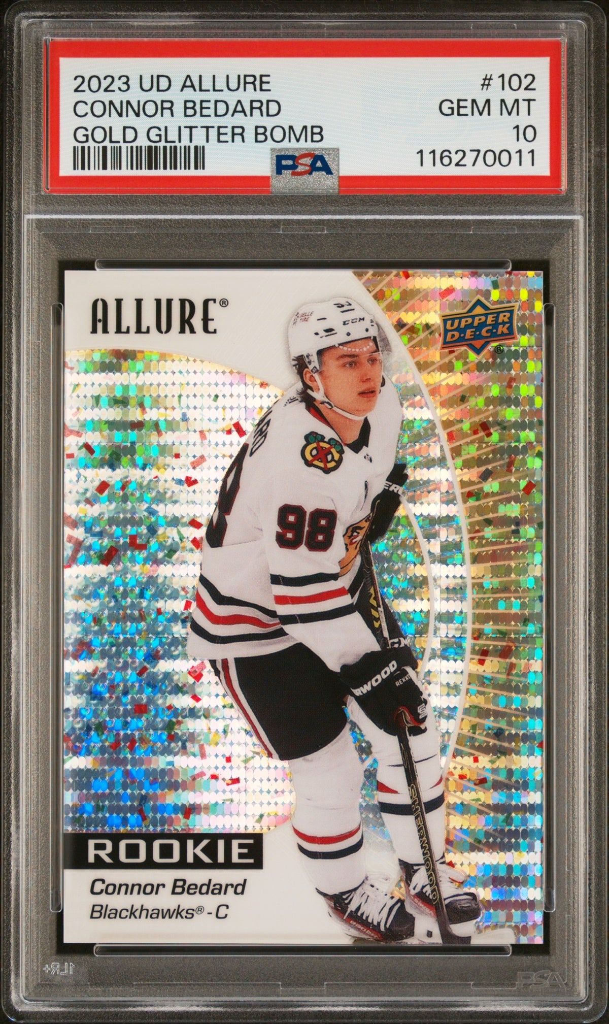 Key features of this card include its rookie status, a perfect PSA GEM MT 10 rating, the Gold Glitter Bomb insert, a limited serial number, and the Upper Deck Allure 2023 branding. This NHL Blackhawks' Connor Bedard collectible is a perfect addition to any sports card collection, offering both aesthetic pleasure and a tangible piece of sports history.