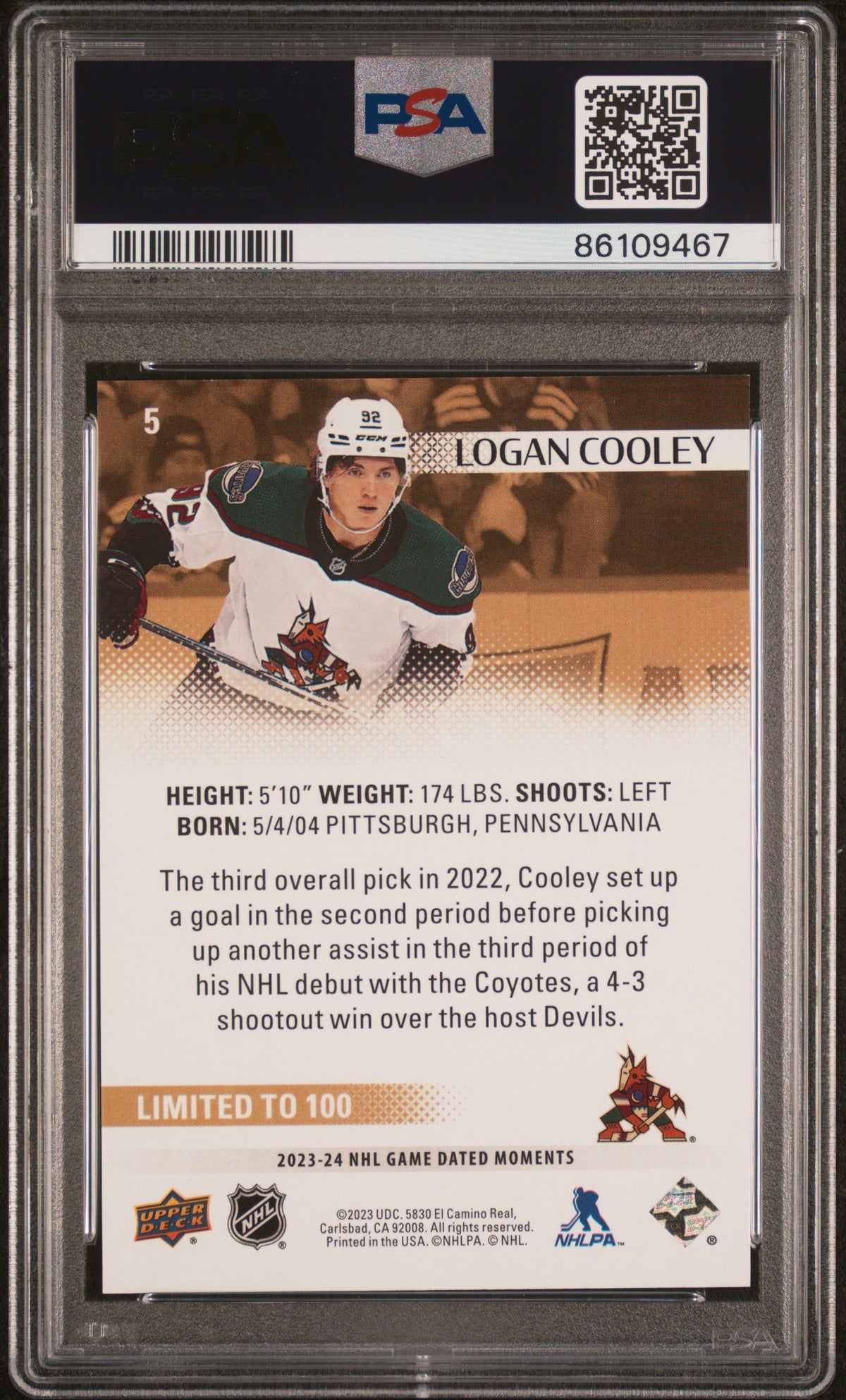This 2023 UD 5 Logan Cooley PSA 10 card is a brilliant addition to any sports card collection, offering not only a piece of NHL history but also a collectible bearing the name of a future star. A must-have for any serious collector, or a Coyotes fan looking to commemorate a standout season. You won't want to miss out on this opportunity to own a piece of Logan Cooley's legacy.