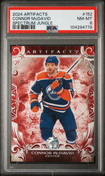 Feast your eyes on this incredible find - a 2024 Artifacts #152 Connor McDavid Spectrum Jungle Parallel! This isn't just any hockey card, it's a highly sought after piece from the Upper Deck's Artifacts series, featuring the dynamic Oilers player, Connor McDavid.