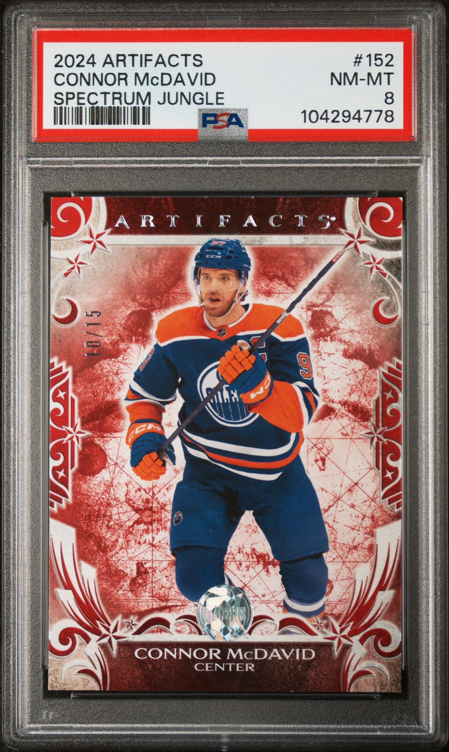 In conclusion, this 2024 Artifacts #152 Connor McDavid Spectrum Jungle Parallel is a remarkable piece of sports memorabilia. Whether you're a fan of Connor McDavid, an Oilers enthusiast, or a collector looking to add a unique card to your collection, this card is a fantastic choice. Its rarity, condition, and the player it represents make it an exciting find that any collector would be lucky to own.