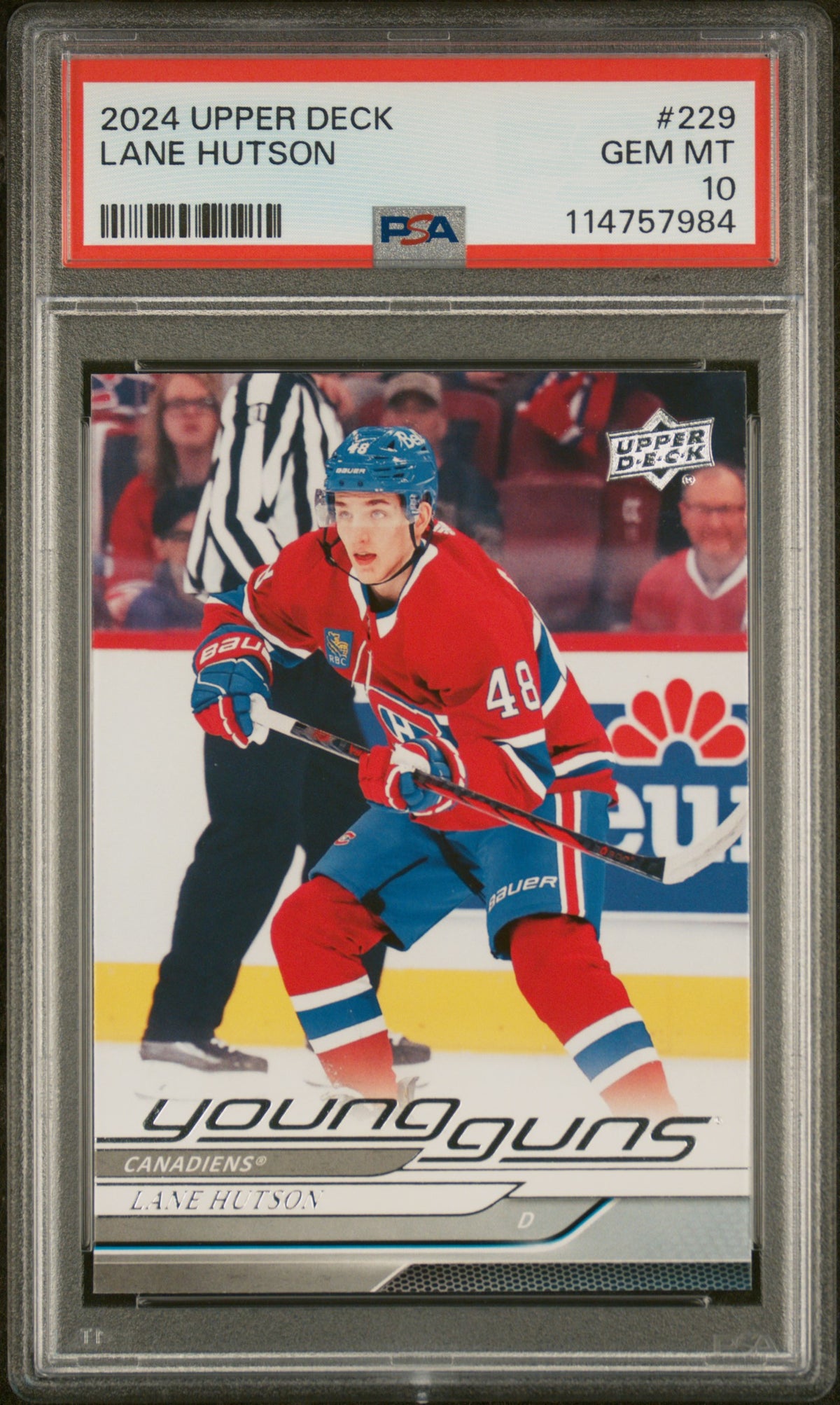 Indulge in the thrill of sports card collecting with this incredible 2024 Upper Deck #229 Lane Hutson card. From the esteemed 'Upper Deck' manufacturers, this card is a part of the much sought-after 'Young Guns' insert set.