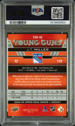 The card, part of the popular 'Young Guns Renewed' insert set, boasts a pristine 'Gem Mint' condition, as certified by the well-renowned grading company, PSA, with a flawless numeric grade of '10'. This card is not merely a piece of cardboard, but a testament to J.T. Miller's prowess on the rink, embodying the spirit, strength, and skill that he brings to the NHL.