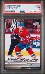 Immerse yourself in the exciting world of hockey with this extraordinary 2024 Upper Deck #229 Lane Hutson card from the coveted 'Young Guns' Insert Set. This professionally graded gem, which boasts an impressive PSA 7 rating, is an essential piece for any serious collector. Its high grade reflects an admirable state of preservation, with the card being described as being in Near Mint (NM) condition.
