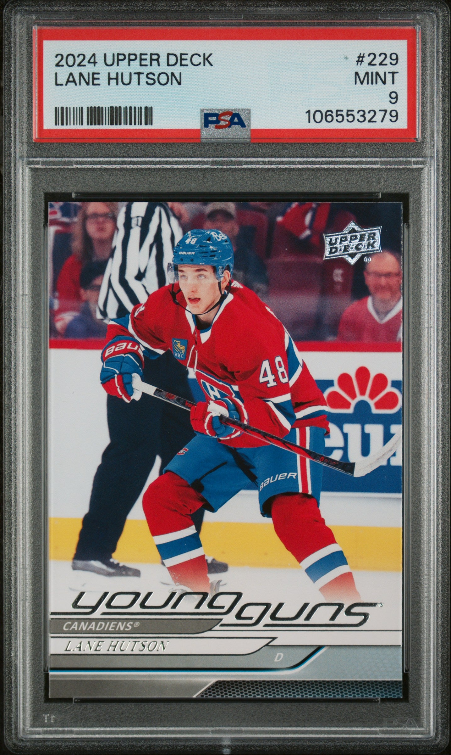 Take a moment to admire this absolutely stunning sports card featuring the talented Lane Hutson. From the esteemed 2024 Upper Deck Young Guns insert set, this card is a fantastic addition to any sports card collection. Positively brimming with potential, Hutson is a rising star in the NHL and his card is as coveted as they come.