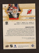This card carries the proud number '18', associated with none other than Vanecek, a star player of the Devils in the NHL. A unique element of this card is the inclusion of a patch, contributing a tactile piece of the game to this collectible. Please note that while this card is not a rookie card or professionally graded, it still carries significant appeal for the discerning collector.