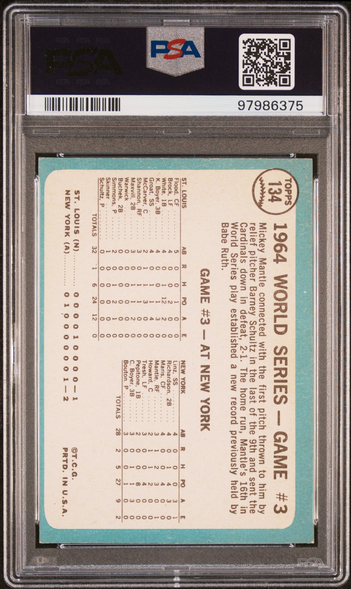 Immerse yourself in the golden era of baseball with this stunning 1965 Topps #134 Mantle card, a must-have addition for any serious collector. Commemorating the World Series Game 3, this card is a tangible piece of history, capturing an iconic moment in sports. Manufactured by Topps, a brand synonymous with quality and credibility in the sports-card industry, this card is a testament to their commitment to preserving the heritage of the game. The card features the legendary player Mantle, who represented the New York team with unparalleled skill and sportsmanship. The card carries a numeric grade of '6' by the prestigious PSA, affirming its condition as 'EX-MT' (Excellent-Mint). This professionally graded card is a testament to its well-preserved condition, making it a valuable and desirable asset for any collection. This card does not merely represent a player; it encapsulates the spirit and fervor of the 1965 World Series. It's not just a piece of cardboard but a gateway to a past filled with thrilling victories and heart-wrenching losses. Add this to your collection and own a piece of baseball's rich history. This 1965 Topps #134 Mantle card, part of the 1965 Topps World Series set, stands out with its key features: Mickey Mantle, 1965 Topps, World Series Game 3, and PSA 6 EX-MT. Each feature adds to the intrigue and allure of this card, making it a treasure trove for sports enthusiasts and collectors alike. In a world where the love for sports and nostalgia intertwines, sports cards like this one serve as a bridge connecting the past and the present. So why wait? Add this vibrant piece of sports history to your collection today and relive the glory days of baseball every time you look at it!