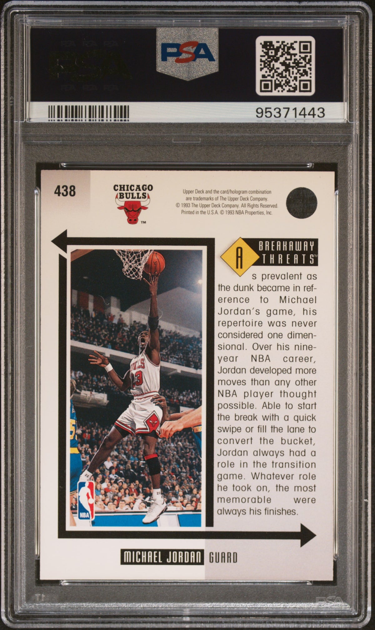 Feast your eyes on this remarkable piece of basketball history! This is a 1993 Upper Deck Breakaway Threats card, proudly featuring the unmatched legend of the court, Michael Jordan. As a key player for the Chicago Bulls, Jordan's impact on the NBA continues to be recognized to this day.