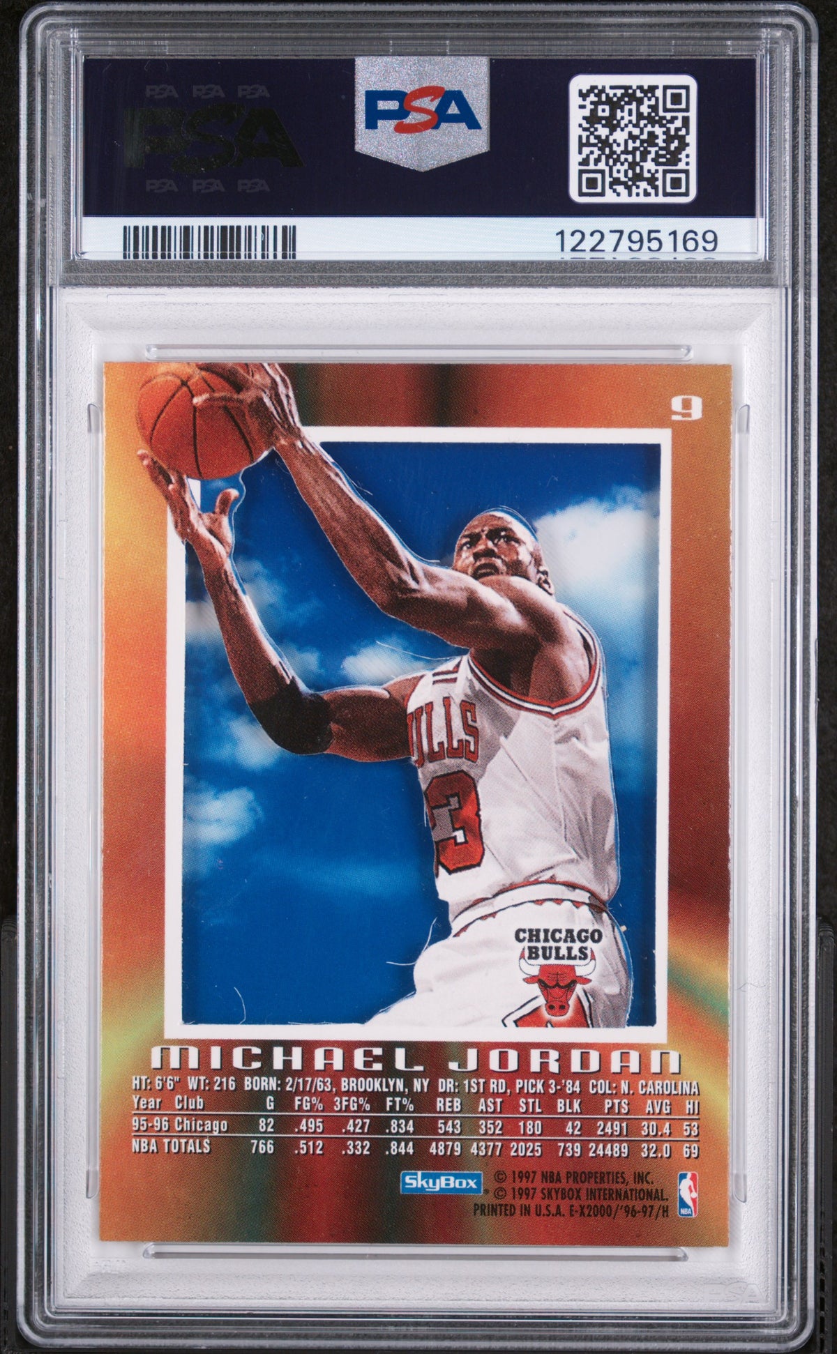 Feast your eyes on this gem of a sports card! Revel in the glory of the basketball legend, Michael Jordan, with this 1996 Skybox E-X2000 card. No ordinary card, this one boasts of a professional grading by the PSA, with an excellent grade of 5.