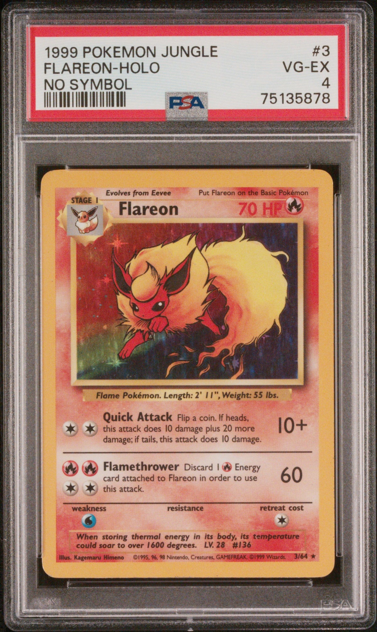 The card features Flareon, the Flame Pokemon, captured in a mesmerizing Holo finish that beautifully enhances its overall appeal. The card comes from the much-loved Pokemon Jungle set, a name that resonates with fans across the globe. As card #3 in this distinguished set, it holds a special place among enthusiasts.