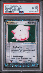 This Chansey ex card is professionally graded by PSA, one of the most trusted grading companies in the industry, and has been awarded a numeric grade of 6, denoting its excellent-mint condition. The card's holo finish brings the character of Chansey ex to life, making it a visually striking addition to any collection.