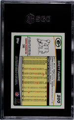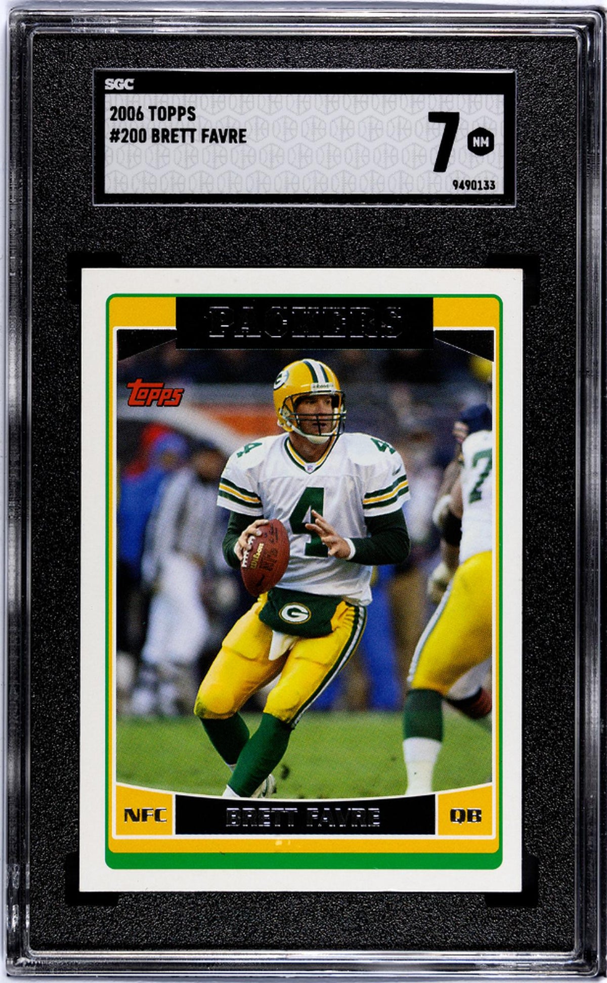 Immerse yourself in the nostalgia of football greatness with this 2006 Topps #200 Brett Favre card. Manufactured by the reputable Topps, this card captures the essence of Favre, a legend in NFL history and a shining star of the Packers team. With a numeric grade of 7 and a condition description of 'NM' (Near Mint), this card has been professionally graded by SGC, a trusted name in the card grading industry. This ensures its authenticity and quality, making it a valuable addition to any collection. The 2006 Topps Football card set is highly sought after by collectors, and this Brett Favre card is no exception. Bearing the image of Favre, known for his impressive skills and tenacity on the field, this card is a tangible piece of football history. While this card does not feature an autograph or memorabilia, its significance lies in its representation of a remarkable player during an iconic year. Its key features include the player Brett Favre, the 2006 Topps series, the Packers team, and its SGC grading, making it a must-have for any sports enthusiast or card collector. In summary, this 2006 Topps #200 Brett Favre card is more than just a piece of cardboard; it is a tribute to a football icon and a testament to his legacy in the NFL. Its excellent condition and professional grading make it an attractive and valuable addition to any sports card collection. Don't miss your chance to own this piece of sports history.