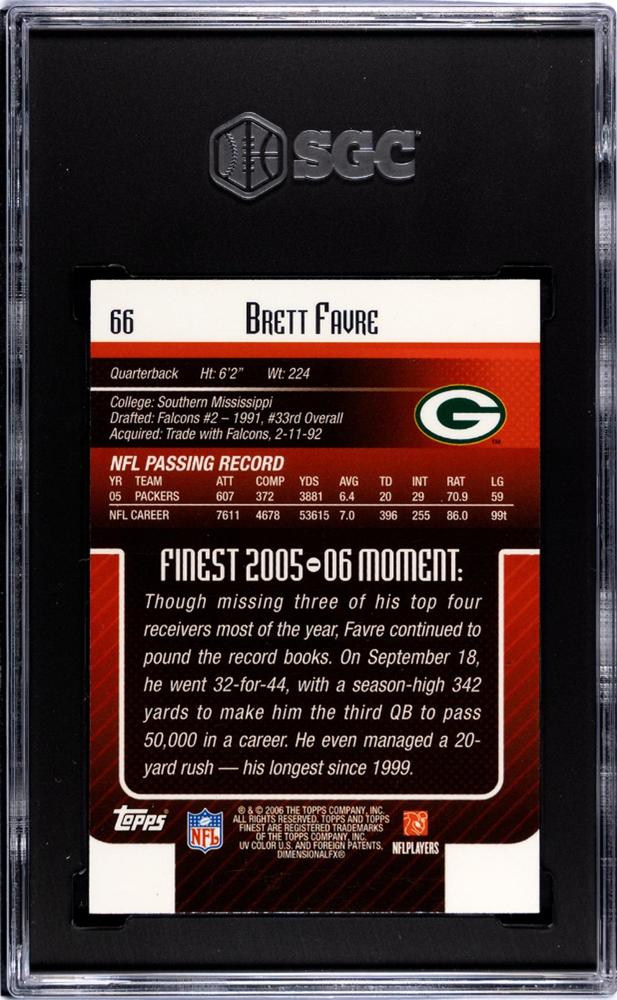 Feast your eyes on this stunning sports card featuring the legendary NFL quarterback, Brett Favre. This 2006 Topps Finest #66 card is a must-have for any serious card collector or Green Bay Packers fan.