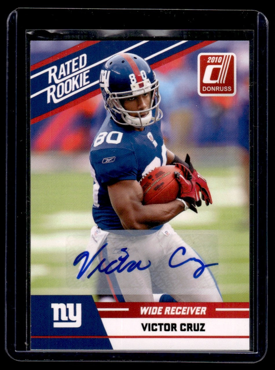 Dive into the thrilling world of sports card collecting with this spectacular 2010 Donruss Rated Rookie card, featuring the dynamic Victor Cruz of the New York Giants. Manufactured by the renowned Panini, this card is a gem, showcasing Cruz, a stand-out player in the NFL, in his rookie year.