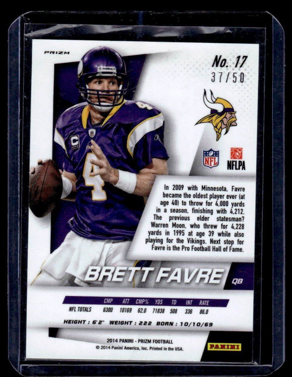 Featuring Brett Favre, one of the most beloved NFL players, this card is a tribute to his time spent with the Minnesota Vikings. Favre's illustrious career, marked by record-setting performances and relentless dedication to the sport, is beautifully encapsulated in this collectible.