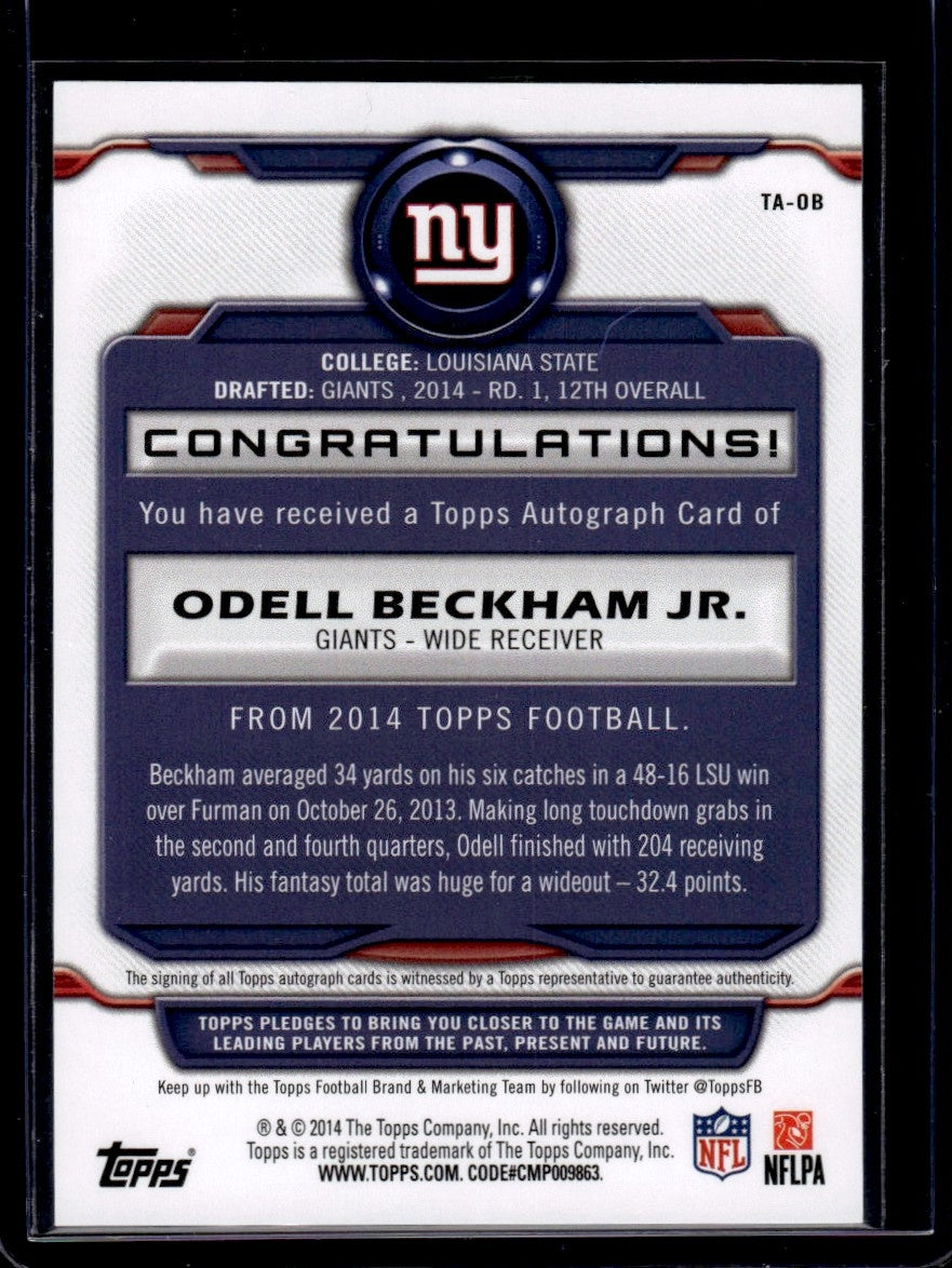 Step into the world of NFL with this stunning 2014 Topps TA-OB Odell Beckham Jr. card. Featuring the highly acclaimed player from the New York Giants, this sought-after collectible is a must-have for any serious card collector or football enthusiast.