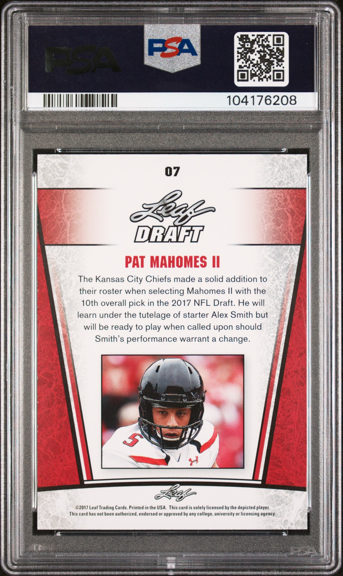 The 2017 Leaf Draft 07 Pat Mahomes II card is not just another sports card - it's a piece of sports history, a tribute to Mahomes' incredible talent, and an investment in the exciting world of football. Don't miss out on owning this stunning piece of memorabilia.