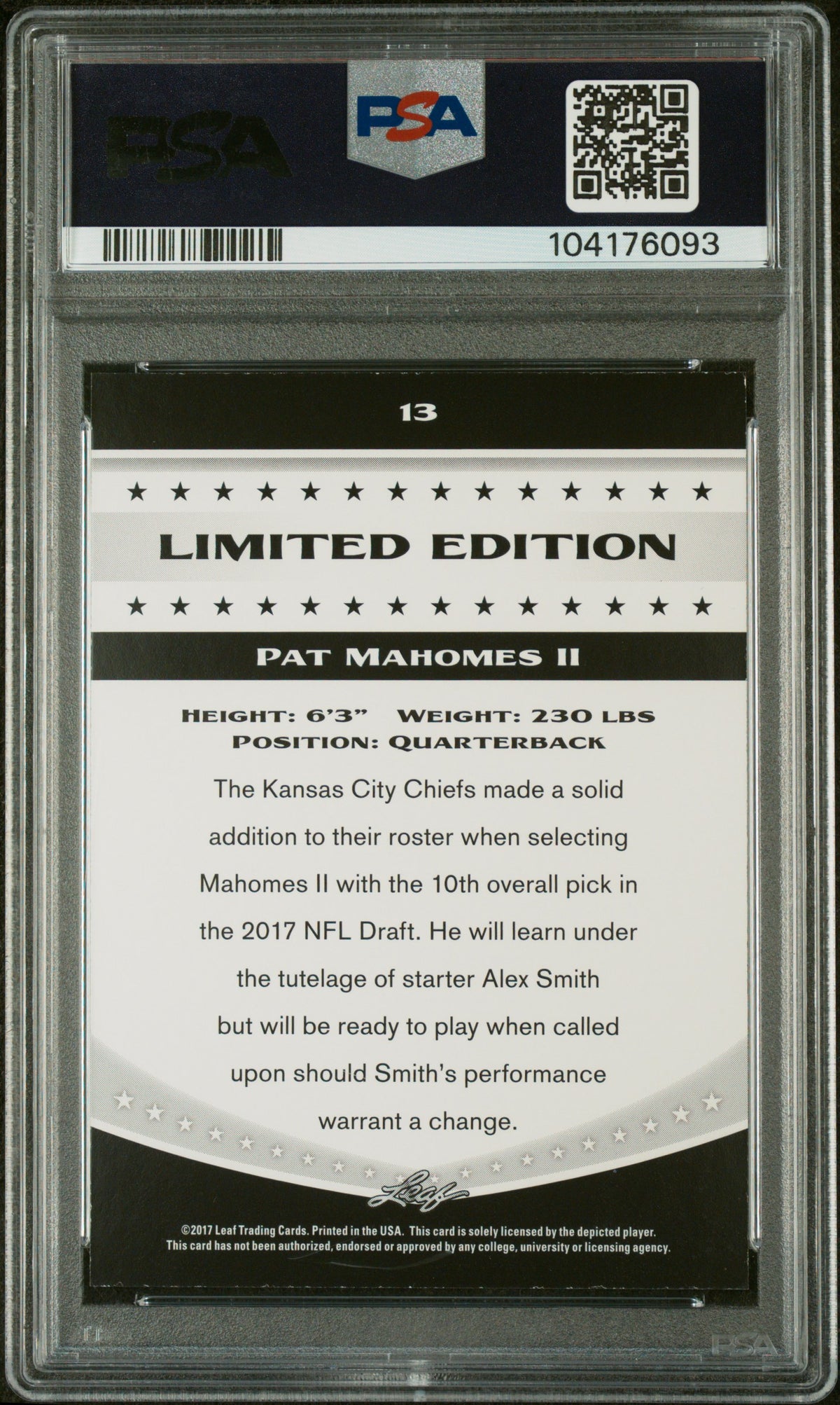 Behold the exquisite 2017 Leaf Limited Edition #13 Pat Mahomes II, a gem of a sports card that any collector would be proud to own. This is a rookie card of Pat Mahomes II, the prodigious quarterback who has consistently proven his mettle with the Kansas City Chiefs in the NFL.