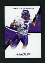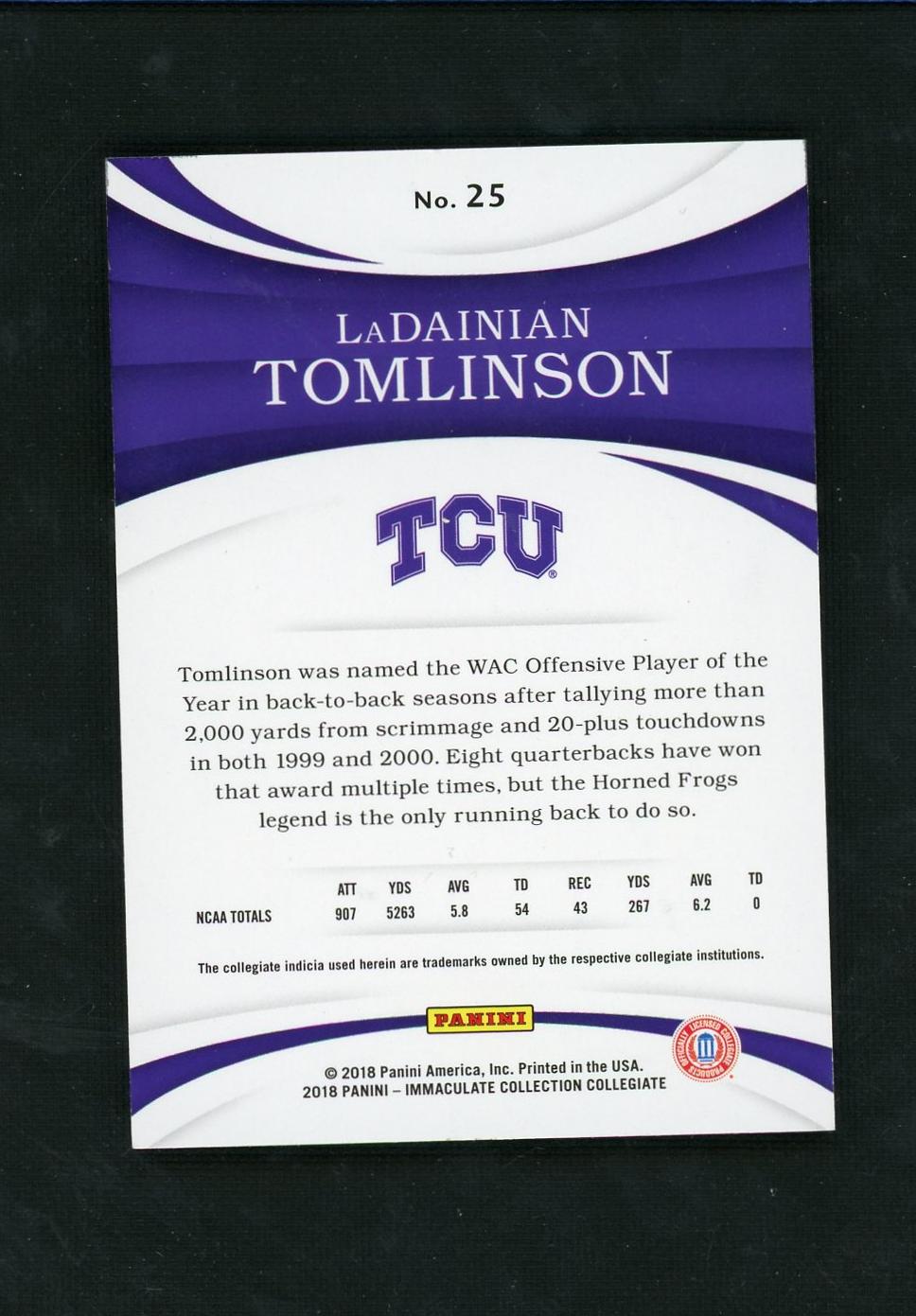 Immerse yourself in the thrilling world of sports memorabilia with this exquisite LaDainian Tomlinson sports card. Produced by the renowned manufacturer, Panini, this card hails from the esteemed Immaculate Collection set of 2018, making it a must-have for any serious collector. This card, numbered 25 in the series, showcases the outstanding talent of LaDainian Tomlinson, a player whose unparalleled agility and prowess on the field have made him a beloved figure in football. Donning his TCU team colors, this card perfectly encapsulates Tomlinson's dynamic athleticism and sportsmanship. Adding to its charm, this card is serial numbered 20/99, making it a rare find and a valuable addition to any collection. Though not a rookie card, its unique features more than make up for it, marking it as a standout piece in the world of football card collecting. While it doesn't bear an autograph or a professional grading, its lack of these elements does not detract from its value. Instead, it adds a layer of intrigue and authenticity, making it a true treasure to discover. This card doesn't just represent a player, it encapsulates an era, a moment in time where LaDainian Tomlinson shone on the field. As a part of the Immaculate Collection Collegiate Card Set, it's a testament to the incredible career of a football icon. In short, this 2018 Immaculate 25 LaDainian Tomlinson card is not just a piece of sports memorabilia, it's a piece of sports history. Whether you're a dedicated collector, a TCU fan, or a sports enthusiast, this card is a fantastic way to celebrate a football legend and elevate your collection to new heights. Don't miss out on owning a piece of the legacy that is LaDainian Tomlinson.