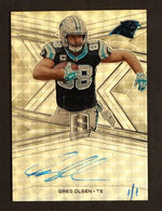 Delight in the magnificent allure of this exclusive 2018 Panini Spectra S-GO football card featuring the legendary Greg Olsen of the Carolina Panthers. This is no ordinary card; it's a one-of-a-kind collector's gem, serial numbered 1/1, making it a truly rare find in the world of sports memorabilia. What makes it even more special is the autograph - yes, this card bears the signature of Greg Olsen himself, adding an extra layer of authenticity and appeal.