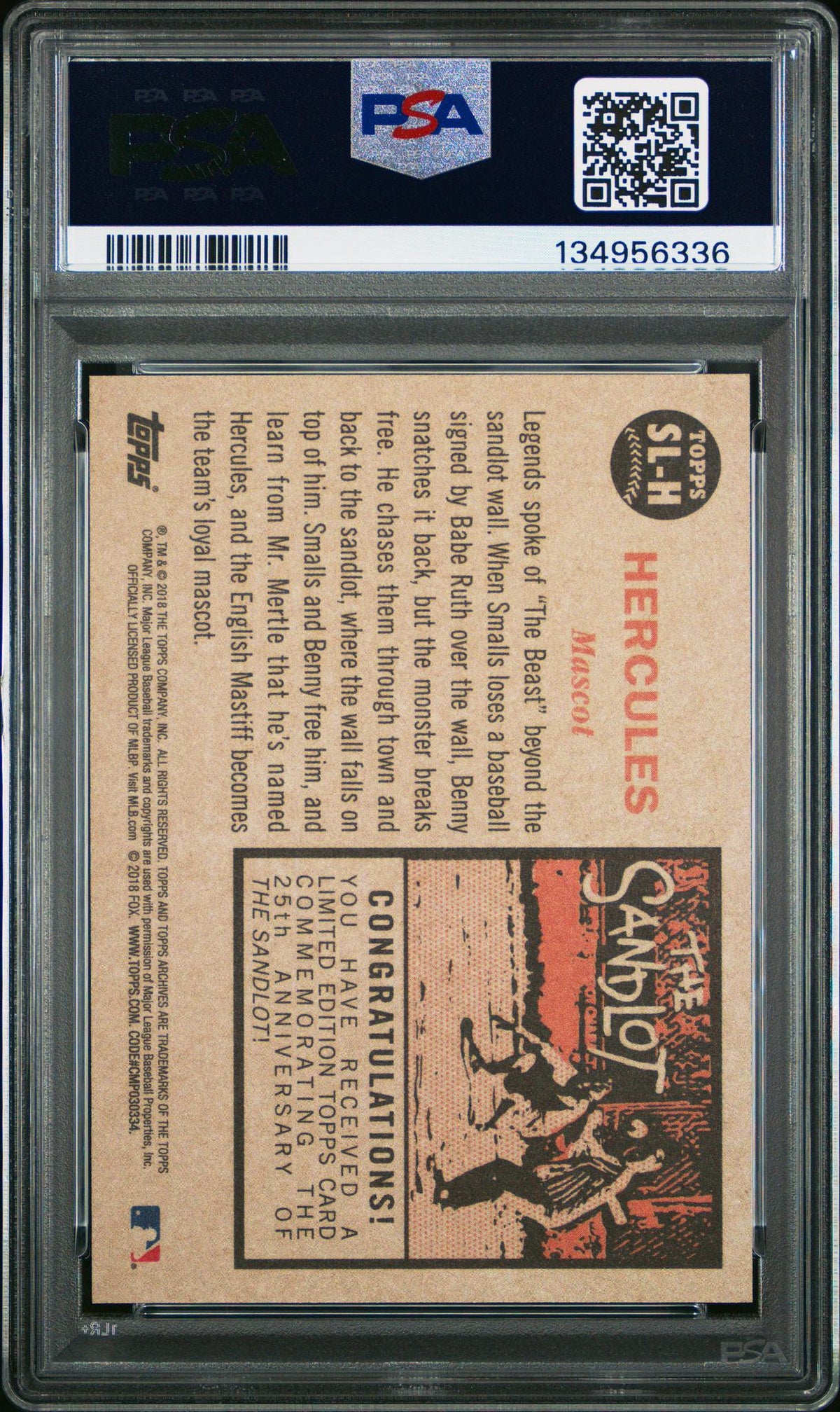Immerse yourself in the world of sports card collecting with this exquisite 2018 Topps Archives SL-H Hercules card. Manufactured by the reputable Topps brand, this card hails from the much-loved 'Topps Archives' set and features the iconic character Hercules from 'The Sandlot'. A true gem for collectors, this card has been professionally graded as 'Mint 9' by the industry-respected grading company PSA, attesting to its impeccable condition. This card, however, is not just a piece of cardboard, but a memento that takes you back to 2018, making it a must-have for any sports card enthusiast or 'The Sandlot' fan. Its key features such as its PSA Mint 9 grading, its origin from the Topps Archives, the depiction of Hercules, and its status as a Limited Edition 25th Anniversary piece make it a truly unique and valuable addition to any collection. This card falls under the 'Other Non-Sport' category, further enhancing its rarity and appeal to a wide range of collectors. Whether you're a seasoned collector or a novice, this 2018 Topps Archives SL-H Hercules card is a collectible that promises to bring joy and a sense of nostalgia. Own a piece of history and give your collection the upgrade it deserves with this remarkable card.