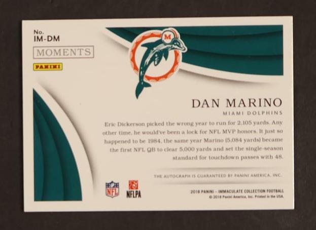 Step into the league of NFL royalty with this immaculate, autographed Dan Marino sports card. Manufactured in 2019 by the reputable Panini brand, this 'Immaculate Collection Moments' card is as prestigious as it gets.