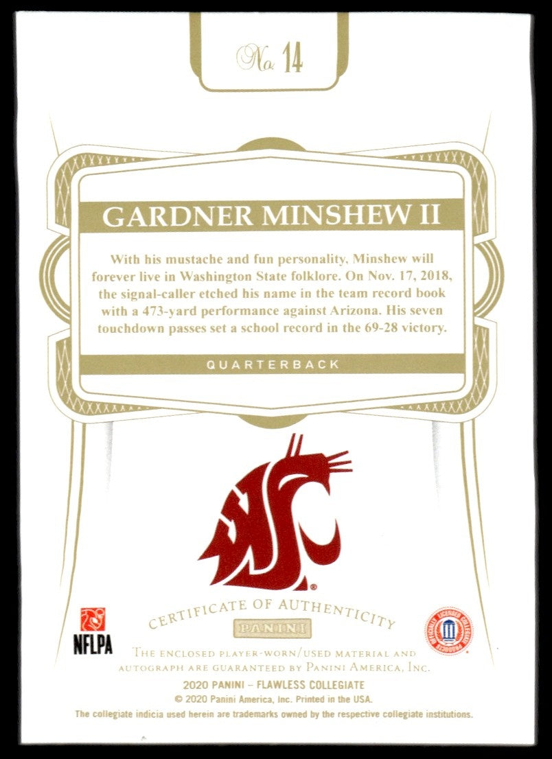 Take a moment to admire this exquisite Gardner Minshew II sports card from the 2020 Flawless Collegiate series by Panini. This gem is not just a card, it's a tangible piece of sports history featuring one of NFL's dynamic talents. With its rarity heightened by its serial numbering of just 09/25, this card is a treasure trove for serious collectors.