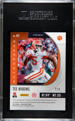 The card is autographed by Tee Higgins himself, a promising and talented player in the NFLPA league. Adding to its rarity, the card holds a serial number of 1/5, making it an extremely limited edition piece. This is a Rookie card, marking the start of Tee Higgins' professional journey, making it a highly sought after collectible.