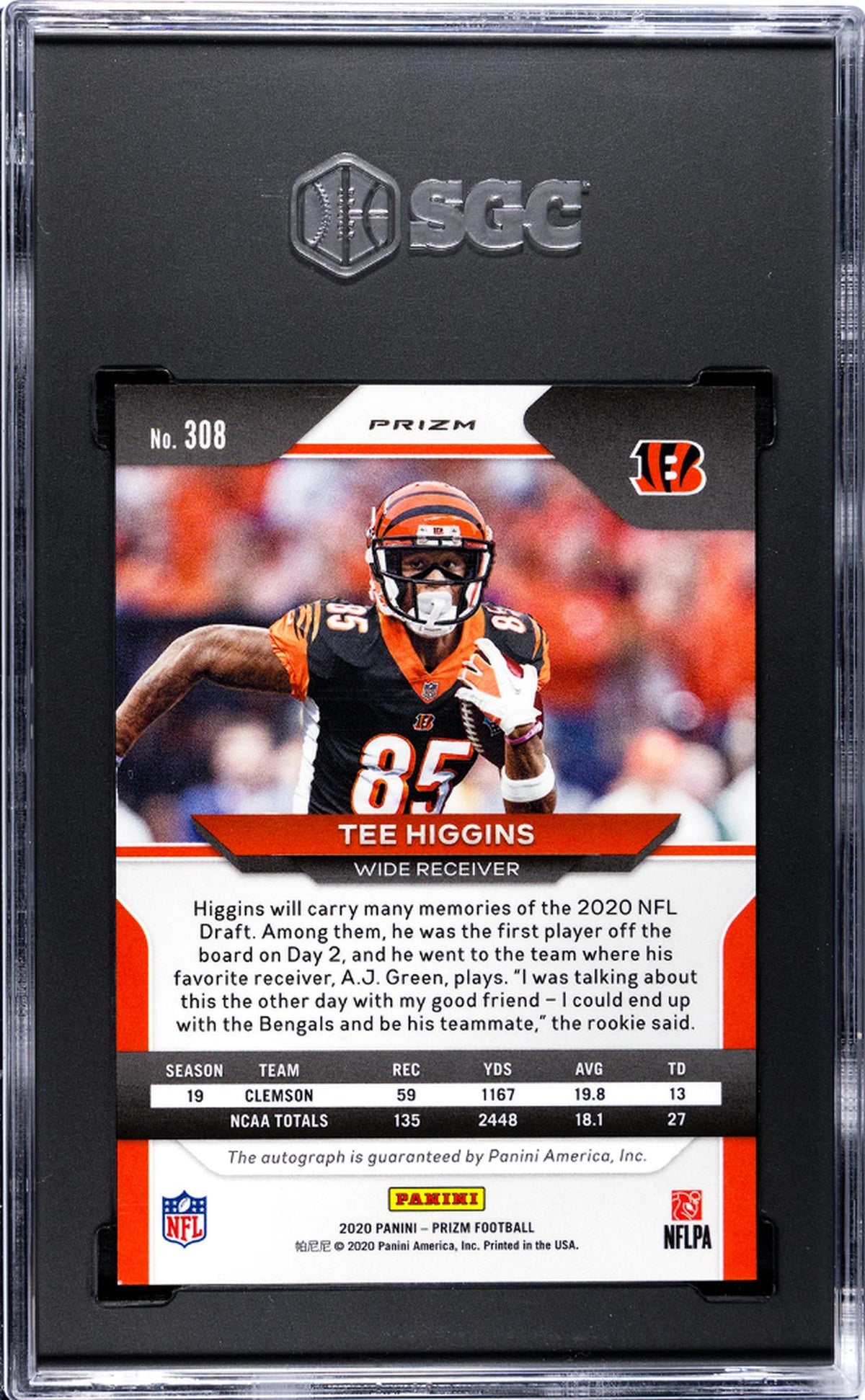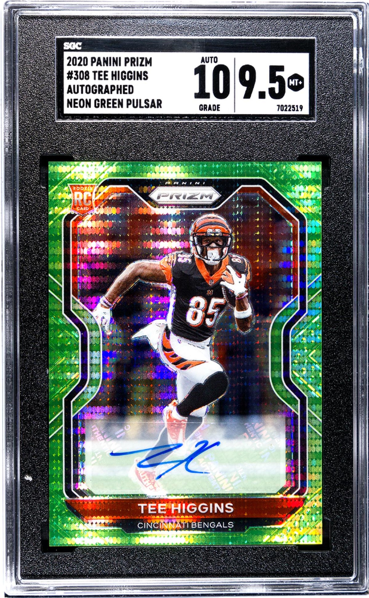 This card holds no memorabilia but its key features - Neon Green Pulsar, Autographed, SGC 9.5, Rookie Card, Tee Higgins, Cincinnati Bengals, 2020 Panini Prizm - make it a must-have for not only Cincinnati Bengals fans but all NFL and sports card enthusiasts.