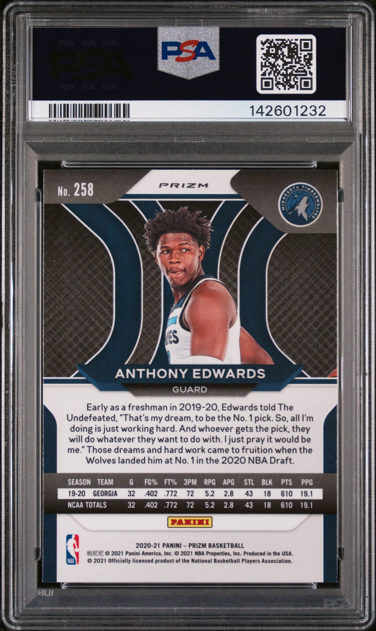 The card features the talented Anthony Edwards, a rising star in the NBA who plays for the Minnesota Timberwolves. As a rookie card, this piece holds immense potential for increasing in value over time, making it an exceptional investment for both new and seasoned collectors.