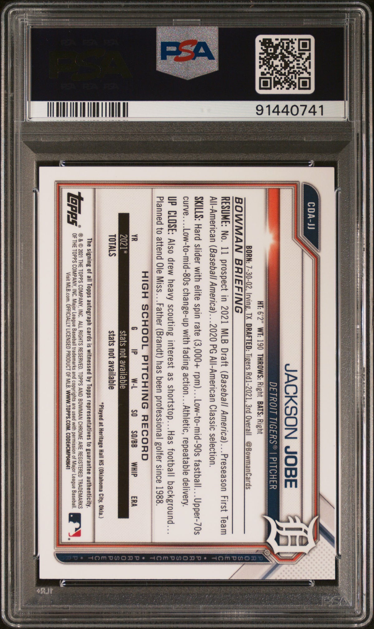 In summary, this 2021 Bowman Chrome CDA-JJ Jackson Jobe card is more than just a piece of cardboard. It's a piece of baseball history, a token of a player's journey, and a valuable asset for any collector. Its unique features and flawless condition make it a star attraction, a true gem that would shine in any collection. Don't miss the chance to own this piece of baseball history!