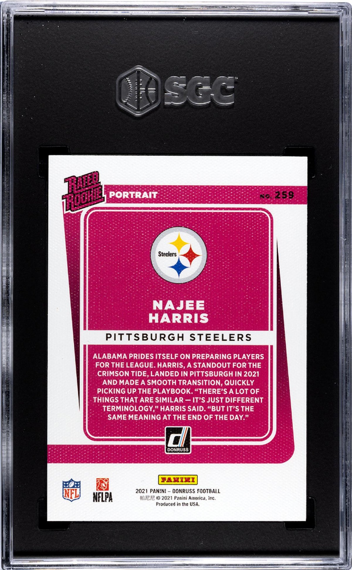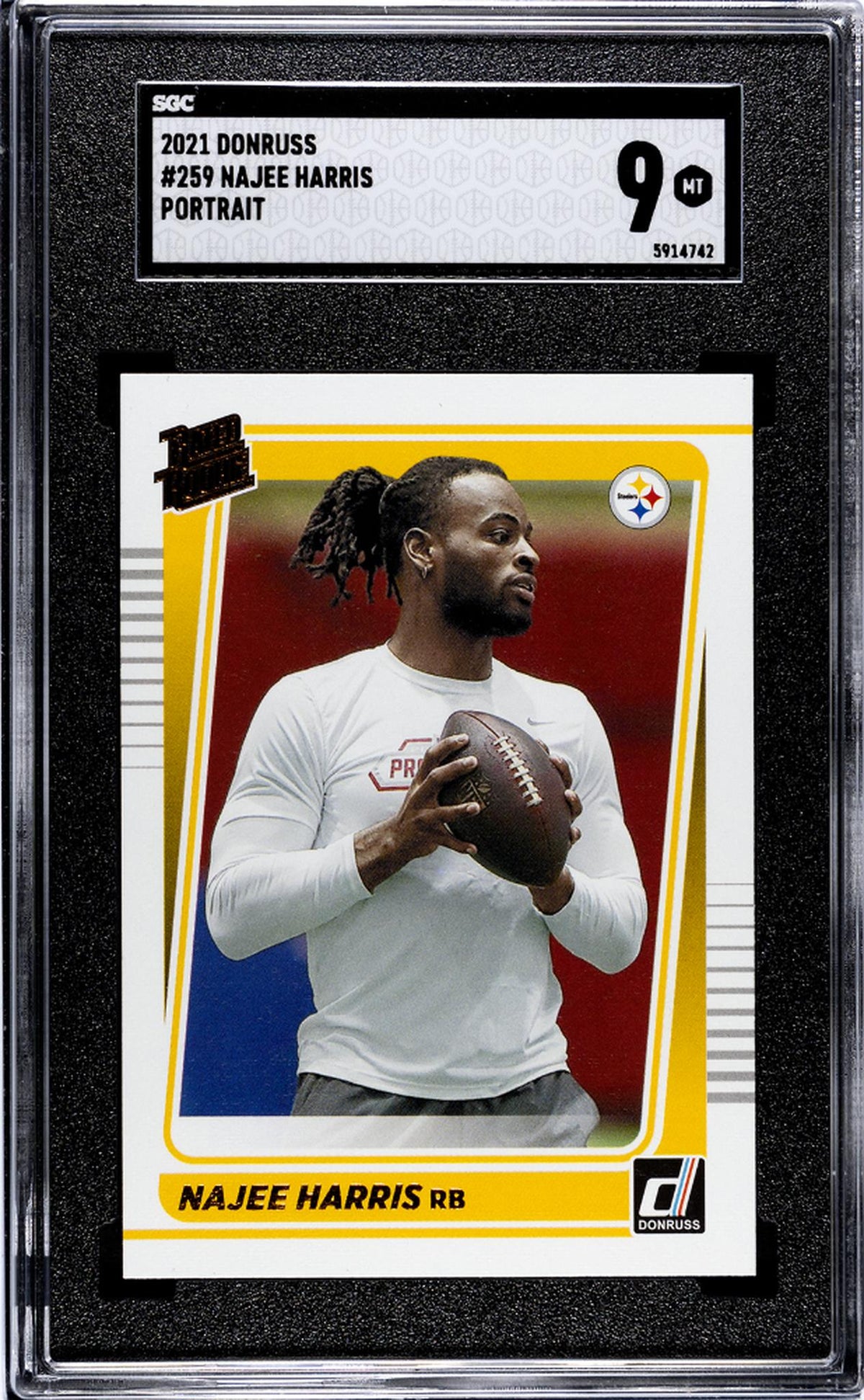 Rated Rookie, Portrait Insert, NFL, Donruss, 2021 - this card is brimming with key features that make it a must-have for any serious collector or avid football fan. Whether you're a Steelers devotee, a Najee Harris fan, or a sports card enthusiast, this card is a fantastic addition to your collection. Add to cart now and own a piece of NFL history with this 2021 Donruss #259 Najee Harris card!