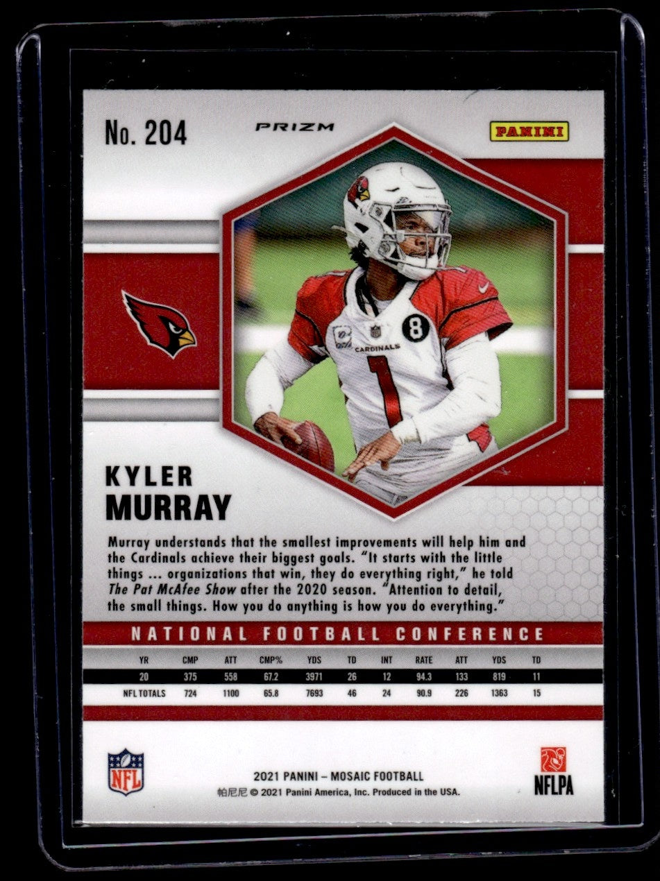 Unveil the glory of NFL with this exquisite 2021 Panini Mosaic Football Card featuring the matchless Kyler Murray of the Arizona Cardinals. This card, numbered 204, is from the esteemed Panini Manufacturer and belongs to the popular Mosaic brand, known for its high-quality and rare collectibles.