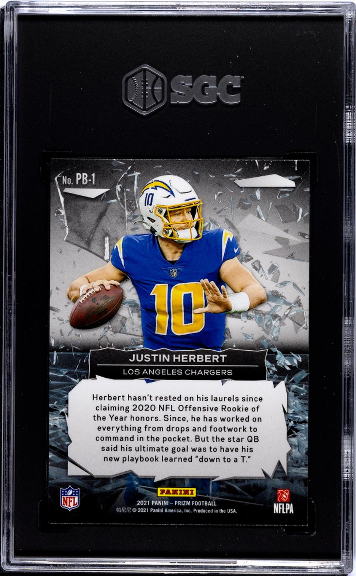 Immerse yourself in the world of football card collecting with this exceptional 2021 Panini Prizm PB-1 featuring the highly acclaimed player, Justin Herbert of the Los Angeles Chargers. This card is not just a piece of cardboard, but a beautifully presented sports artifact, encapsulating the essence of the NFL. This particular card is from the admired 'Prizm Break' insert set, a mark of Panini's commitment to delivering quality and uniqueness in their collections. The Prizm brand is celebrated among collectors for its distinctive design, enhancing the overall appeal of the card. What sets this card apart is its professional grading. Evaluated by the trusted experts at SGC, it has been awarded a perfect numeric grade of '10', indicating its 'Gem Mint' condition. This is a testament to the card's impeccable state, devoid of any visible flaws, and preserving the integrity of the original print. Justin Herbert's presence on the card adds immense value to it. Known for his breathtaking performances with the Los Angeles Chargers, having his card in your collection is akin to owning a piece of NFL history. Despite not being a rookie card, its significance is undiminished, reflecting Herbert's continued impact and contribution to the sport. This card does not come with an autograph or memorabilia, but its allure lies in its simplicity and the prominence of the player it features. Its status as a professionally graded card amplifies its worth, making it a prized asset for collectors and football enthusiasts alike. In summary, this 2021 Prizm PB-1 Justin Herbert card, from the 'Prizm Break' insert set, in 'Gem Mint' condition, is a must-have addition to your collection. Its connection to the NFL, the Los Angeles Chargers, and Justin Herbert, coupled with its flawless condition and professional grading, makes this card a tangible representation of your passion for football. Secure this card today and experience the thrill of owning a piece of sports history.